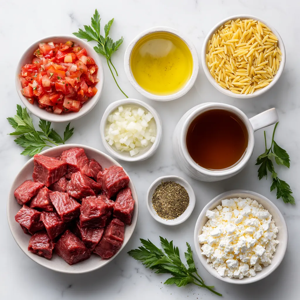 Choose beef that has good marbling for more flavor. A bright red onion adds a nice sweetness. For tomatoes, go for the ripest ones or high-quality canned ones. Look for orzo that is firm and not broken. Fresh parsley should be vibrant green without wilting. If using feta, select a block for the best texture and taste.
