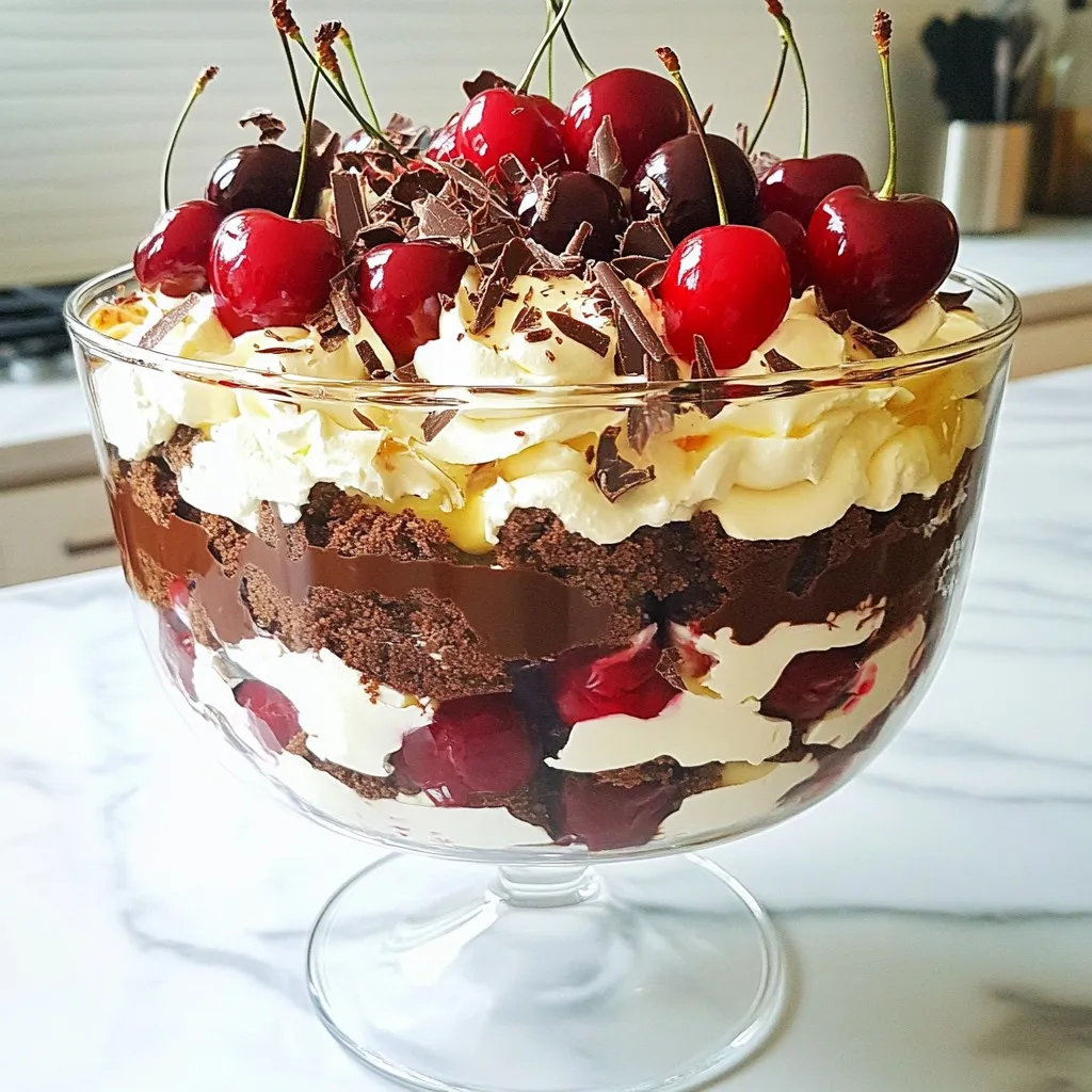 This Black Forest Trifle is a delight. It layers flavors that make your taste buds sing. You start with soft, crumbled chocolate cake. This cake can be store-bought or homemade. Next, you add fresh cherries. Their bright taste pairs well with chocolate.