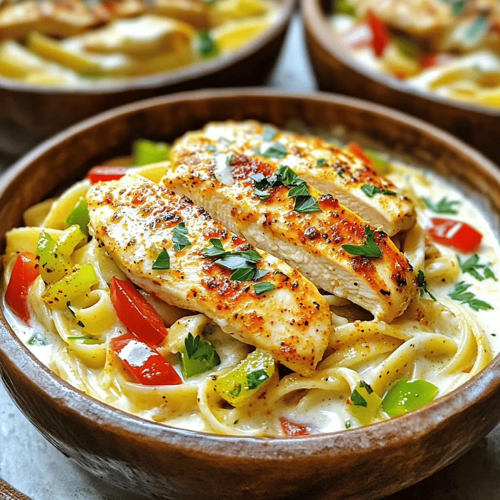 - 2 boneless, skinless chicken breasts - 8 oz fettuccine pasta - 1 cup heavy cream - 1 cup grated Parmesan cheese - 2 tablespoons Cajun seasoning - 2 tablespoons olive oil - Salt and pepper, to taste - 1 red bell pepper, sliced - 1 green bell pepper, sliced - 1 small onion, thinly sliced - 3 cloves garlic, minced To make Cajun chicken pasta, you need fresh, quality ingredients. Start with two boneless, skinless chicken breasts for the main protein. They cook quickly and soak up flavor well. Fettuccine pasta is perfect for this dish, as it holds the creamy sauce nicely. You will also need heavy cream and grated Parmesan cheese. These make the sauce rich and smooth. Next, grab Cajun seasoning. This spice blend gives the dish its signature kick. You will also need olive oil for cooking. Salt and pepper help enhance all the flavors. For the veggies, choose a red and a green bell pepper for color. A small onion adds sweetness, while garlic gives a lovely aroma. These ingredients come together to create a delightful meal. Each component plays a role in building layers of flavor. 1. Start by boiling a large pot of salted water. 2. Once it boils, add 8 oz of fettuccine pasta. 3. Cook the pasta until it is al dente. This usually takes around 8-10 minutes. 4. After cooking, drain the pasta and set it aside. 1. While the pasta cooks, take 2 boneless, skinless chicken breasts. 2. Generously season both sides with 2 tablespoons of Cajun seasoning. 3. In a large skillet, heat 2 tablespoons of olive oil over medium-high heat. 4. Add the seasoned chicken breasts and sear them until golden brown. This takes about 5-7 minutes on each side. 5. Once cooked, remove the chicken and let it rest before slicing into strips. 1. In the same skillet, add sliced red and green bell peppers, a small sliced onion, and 3 minced garlic cloves. 2. Sauté the mixture for about 5 minutes until the vegetables are tender and fragrant. 1. Lower the heat and pour in 1 cup of heavy cream. 2. Let it simmer gently, stirring occasionally. This helps the cream thicken slightly. 3. Gradually add 1 cup of grated Parmesan cheese and mix until melted and creamy. 4. Season the sauce with salt and pepper to taste. 1. Add the drained fettuccine and sliced chicken into the skillet. 2. Toss everything together until the pasta and chicken are evenly coated in the creamy sauce. 1. Cook the combined pasta and chicken on low heat for an additional 2 minutes. 2. This step warms everything through and blends the flavors. 3. Serve the dish in bowls and garnish with fresh parsley. Enjoy your meal! To adjust the spice levels, start with less Cajun seasoning. You can always add more later. If you want a milder taste, mix in some paprika or garlic powder. For a bolder flavor, try adding cayenne pepper. Marinating the chicken adds depth. Use Cajun seasoning, olive oil, and lemon juice. Let it sit for at least 30 minutes for better flavor. If you have time, marinate overnight for the best results. To control the thickness of your cream sauce, simmer it longer. This helps it reduce and thicken. If it's too thick, add a splash of chicken broth or milk. Stir well to combine. If you need substitutes for heavy cream, you can use half-and-half or a mix of milk and butter. For a lighter option, try Greek yogurt. Just whisk it in slowly to avoid curdling. For garnishing ideas, sprinkle fresh parsley on top. This adds a nice color and flavor. You can also add some crushed red pepper for a pop of color. Serving recommendations include rustic bowls for a cozy feel. Pair the dish with a crisp green salad or garlic bread to balance the flavors. This makes your meal look inviting and delicious. {{image_4}} You can switch the chicken for shrimp. Shrimp cooks fast and adds a nice flavor. Just sauté the shrimp in the same skillet. Cook them until they’re pink and firm. If you want a vegetarian dish, try using tofu. Press the tofu to remove extra water. Cut it into cubes and season it like chicken. It will soak up the Cajun spice and taste great. While fettuccine is classic, you can use penne or linguine too. Both types hold the sauce well. Penne adds a fun, chewy texture. Linguine gives a nice twist to your dish. If you need gluten-free options, look for rice or quinoa pasta. They cook differently, so follow the package instructions. They still offer a delicious meal that everyone can enjoy. To boost flavor, add sun-dried tomatoes. They give a sweet and tart taste that pairs well. Spinach is another great option. It wilts down nicely and adds nutrients. Feel free to mix in other veggies too. Zucchini, mushrooms, or asparagus can work well. This way, you make the dish your own and add extra colors. To store leftovers of Cajun chicken pasta, let it cool down first. Place it in an airtight container. Make sure to seal it tightly to keep it fresh. You can store it in the fridge for up to three days. I recommend using glass containers. They do not stain and help keep flavors intact. For reheating, the best method is using the stovetop. Place the pasta in a skillet over low heat. Add a splash of cream or water to keep it moist. Stir often to avoid burning. If you use a microwave, cover it with a damp paper towel. This helps prevent the pasta from drying out. Avoid reheating it too long, as it can get soggy. You can freeze portions of Cajun chicken pasta for future meals. Divide it into single servings and place them in freezer-safe bags. Remove as much air as possible to prevent freezer burn. It can last for up to three months in the freezer. When ready to eat, thaw it overnight in the fridge. After thawing, reheat it using the stovetop method for the best texture. Cajun chicken pasta is a creamy, spicy dish. It combines tender chicken, fettuccine, and bell peppers. The bold flavors come from Cajun seasoning. This dish is rich and satisfying, perfect for a weeknight dinner. Yes, you can prepare Cajun chicken pasta in advance. Cook the chicken and veggies, then mix them with