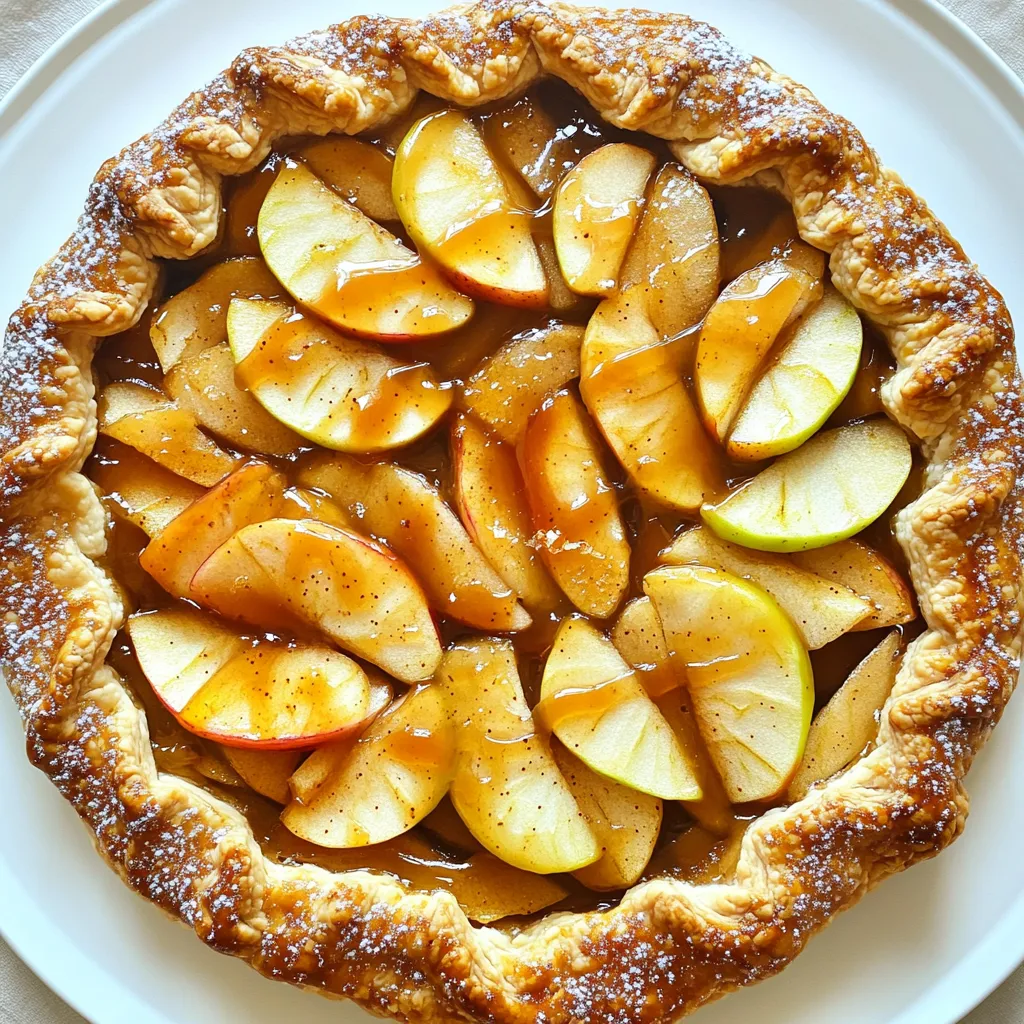 - 2 medium apples (Granny Smith or Honeycrisp recommended), peeled and thinly sliced - 1 tablespoon fresh lemon juice - 1/4 cup granulated sugar - 1/4 teaspoon ground cinnamon - 1/4 teaspoon ground nutmeg - 1 pre-made pie crust (store-bought or homemade) - 1/4 cup rich caramel sauce, with extra for drizzling on top - 1 tablespoon unsalted butter, cut into small cubes To make a great caramel apple galette, you need fresh apples. Granny Smith adds a tart taste, while Honeycrisp gives sweetness. Lemon juice keeps the apples bright. Sugar brings out the sweetness of the apples, while cinnamon and nutmeg add warmth and spice. A pie crust wraps it all up, holding the tasty filling inside. Rich caramel sauce gives that sweet, sticky finish, and butter adds a creamy touch. - Coarse sugar for sprinkling - 1 egg, beaten (for egg wash) You can sprinkle coarse sugar on top for crunch. An egg wash gives the crust a golden finish. Both are not necessary but can make your galette even nicer! 1. Preheat your oven to 400°F (200°C). This heat makes the crust nice and crisp. 2. Prepare your baking sheet. Line it with parchment paper. This stops the galette from sticking. 3. In a bowl, combine the apple slices with lemon juice, sugar, cinnamon, and nutmeg. Toss them well. 4. Let the apple mix sit for about 10 minutes. This helps the flavors blend and softens the apples. 1. On a floured surface, roll out the pie crust. Aim for about 12 inches wide. 2. Carefully move the crust to your baking sheet. Make sure it sits right in the center. 3. Place the apple mixture in the middle. Leave a 2-inch border around the edges. 4. Drizzle 1/4 cup of caramel sauce over the apples. Add cubes of butter on top for richness. 5. Fold the edges of the crust over the filling. Create nice pleats for a rustic look. 6. Brush the crust with the beaten egg. This gives it a lovely golden color. Optionally, sprinkle coarse sugar on the crust for sparkle. 1. Bake your galette for 25-30 minutes. Look for a golden crust and tender apples. 2. Once baked, take it out and drizzle more caramel sauce on top. It will soak into the warm apples. 3. Let it cool for a few minutes before slicing. Enjoy your delicious treat! Letting the apple mixture sit is key. This allows the flavors to blend. The apples soften a bit, making them sweeter. Use a sharp knife to slice your apples. Thin slices cook evenly and look nice. Aim for about 1/8-inch thick slices. This way, your galette will bake perfectly. Handling the pie crust right matters. Roll it out to about 12 inches wide. If it cracks, patch it with bits of dough. Keep your hands cool when working with the dough. Warm hands can make it tough. For a golden crust, use an egg wash. Brush the edges with the beaten egg. This gives a nice shine when baked. Serve your galette warm for the best taste. A scoop of vanilla ice cream pairs well. Whipped cream is another tasty option. For a fun touch, sprinkle cinnamon on top. You can also add grated chocolate for a sweet twist. These small details make your dish shine. {{image_4}} You can use many kinds of apples in your galette. Granny Smith apples are tart and crisp. Honeycrisp apples bring a sweet, juicy flavor. For a different taste, try Fuji or Gala apples. They add a nice sweetness. Seasonal options are great, too. Use any apples you find at your local market. The fresher the apple, the better the flavor. If you need a gluten-free galette, start with a gluten-free pie crust. Many stores sell ready-made gluten-free crusts. You can also make your own with almond flour or rice flour. For the filling, simply use the same recipe. Just make sure your sugars and spices are gluten-free. Everyone can enjoy this tasty treat! You can make your galette even better with some fun additions. Try adding chopped nuts like walnuts or pecans for crunch. Dried fruits like raisins or cranberries also add sweetness. Want to spice things up? Add a dash of ginger or allspice to your apples. These little changes can make your dessert unique and delicious! To keep your caramel apple galette fresh, store it in an airtight container. This helps lock in moisture and flavor. Place it in the fridge if you plan to eat it within a few days. If you want to keep it longer, consider freezing it. Wrap the galette well in plastic wrap, then place it in a freezer bag. This way, it stays tasty for up to three months. To enjoy your galette warm, reheating is key. The oven is the best method for keeping the crust crispy. Preheat your oven to 350°F (175°C). Place the galette on a baking sheet and cover it with foil. Heat it for about 10-15 minutes. If you’re in a hurry, the microwave works too. However, this method makes the crust soft. Heat slices for about 30 seconds, checking often to avoid overcooking. Enjoy your delicious galette just like fresh! How long does the galette last in the fridge? The galette stays fresh in the fridge for about three days. Make sure to cover it well. This keeps it from drying out. Can I make the galette ahead of time? Yes, you can prepare the galette a day in advance. Just store it in the fridge after baking. Reheat it in the oven for a warm treat. What are the best sides to serve with caramel apple galette? I love to serve this galette with vanilla ice cream or fresh whipped cream. A scoop of ice cream melts beautifully on a warm slice. Can I freeze the galette for later use? Absolutely! You can freeze the galette after baking. Wrap it tightly in plastic wrap and then foil. It can last for about two months in the freezer. Baking a caramel apple galette is simple and fun. You learned about essential and optional ingredients, from tasty apples to sweet spices. I shared step-by-step instructions for preparing, assembling, and baking. Tips helped perfect your galette, and variations let you explore flavors. Storing and reheating ensure leftover enjoyment. Remember, making this dessert is all about creativity and fun. Enjoy every bite of your warm, caramel apple g