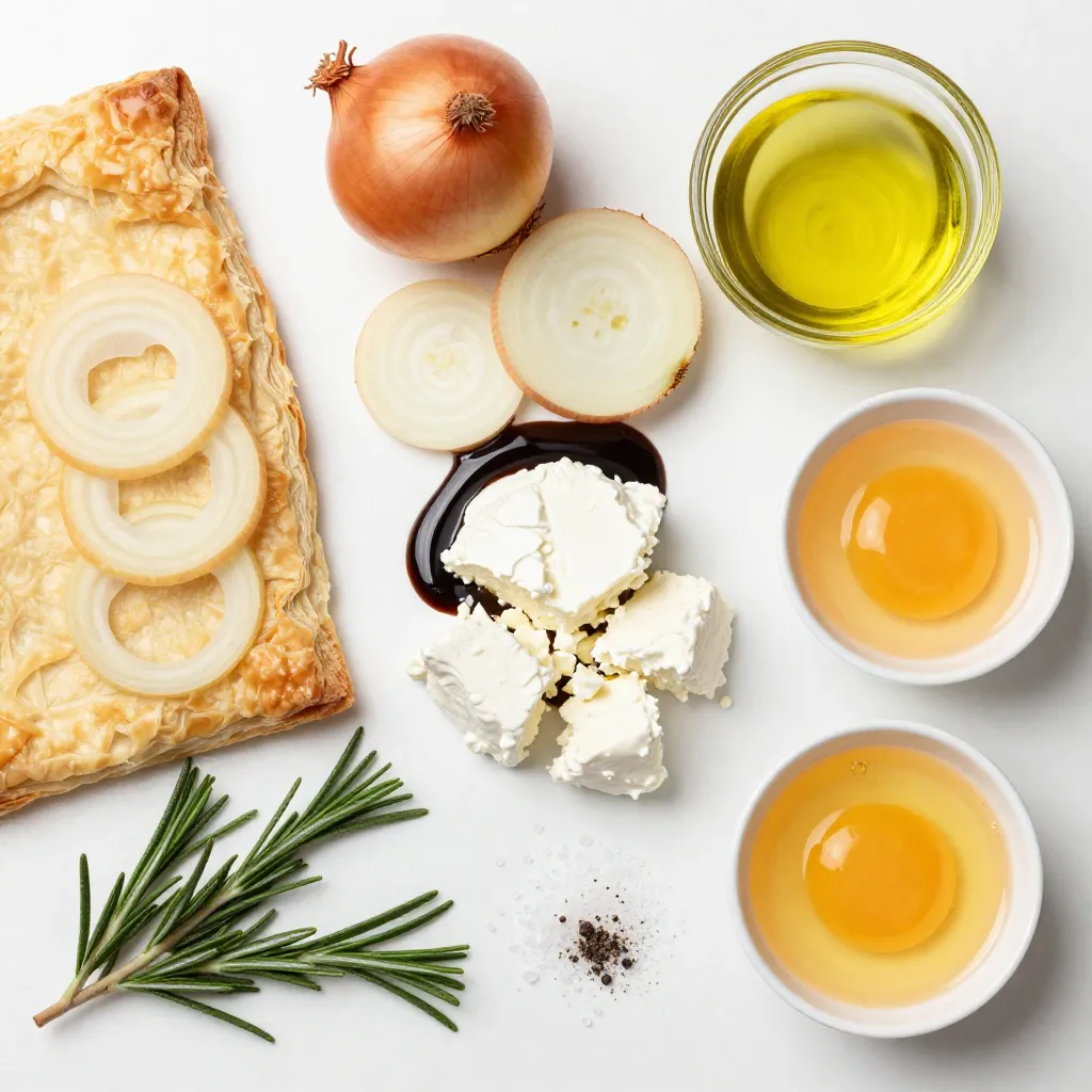A delicious tart featuring caramelized onions and creamy goat cheese, perfect as an appetizer or main dish.