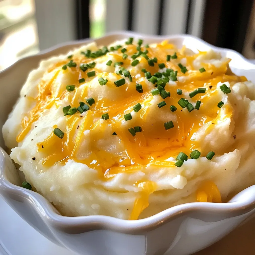 Creamy mashed potatoes infused with garlic and topped with cheddar cheese.
