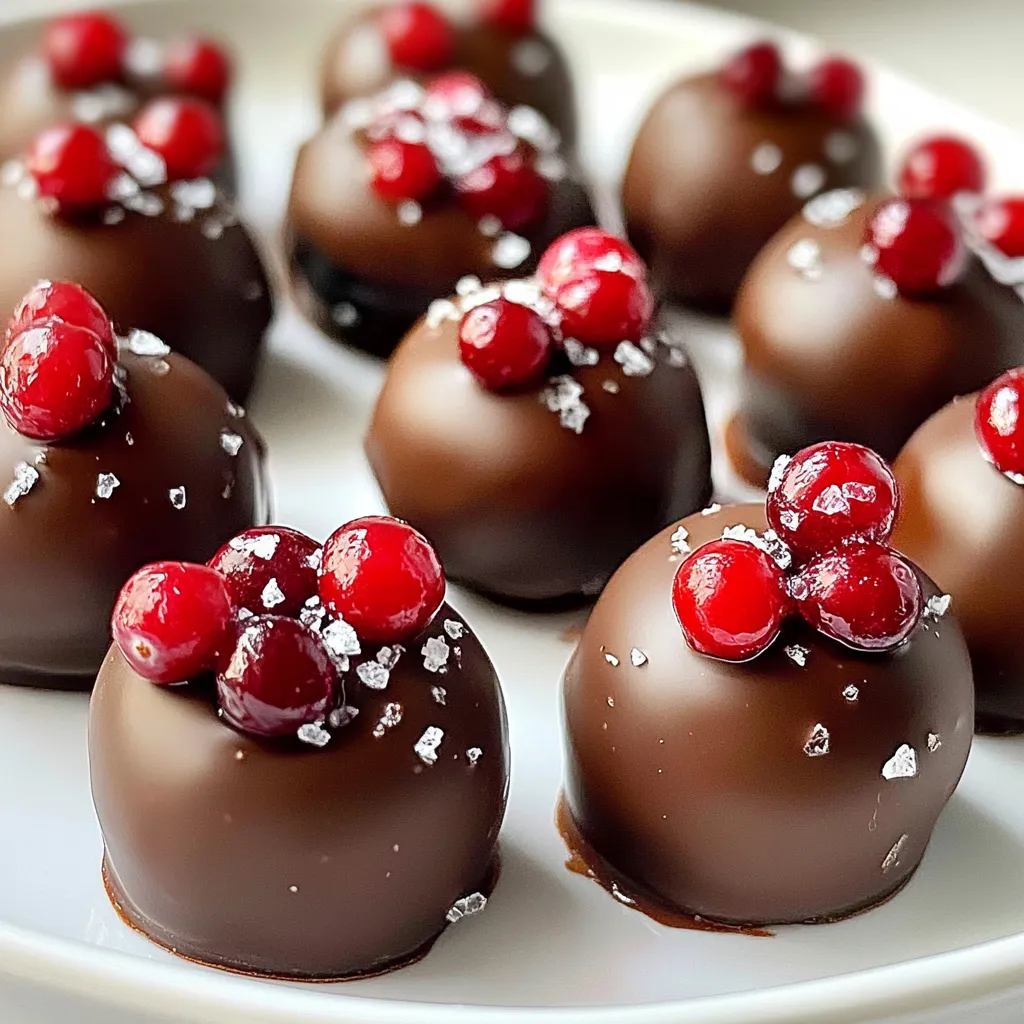 Delicious bites of cranberry sauce coated in silky dark chocolate, topped with flaky sea salt.