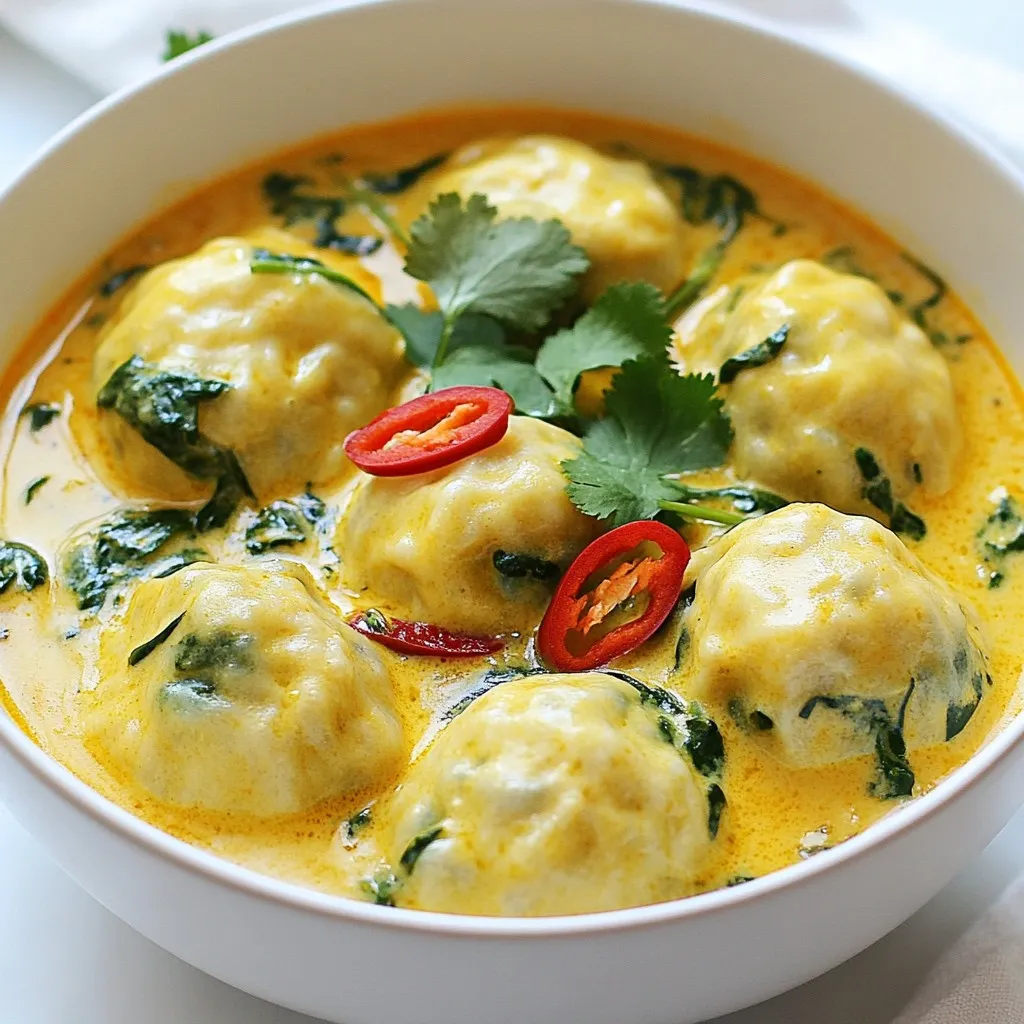 To create the rich flavor of this soup, we need a few key items: - 4 cups coconut milk - 1 cup vegetable broth - 2 tablespoons red curry paste - 1 tablespoon soy sauce - 1 tablespoon freshly squeezed lime juice - 1 tablespoon ginger, freshly grated - 1 tablespoon garlic, minced - 1 cup fresh spinach, finely chopped These ingredients blend well to create a creamy, spicy base. The dumpling dough is simple but essential. Here’s what you’ll need: - 1 cup all-purpose flour - 1/2 cup water - 1/2 teaspoon salt This dough holds the filling and gives the dumplings their texture. To finish your soup, add these touches: - Fresh cilantro leaves for garnish - 1 red chili, thinly sliced (optional for heat) These add color and a fresh kick to your dish. Enjoy customizing your bowl! {{ingredient_image_2}} To start, grab a medium bowl. Combine 1 cup of all-purpose flour with 1/2 teaspoon of salt. Slowly add in 1/2 cup of water. Mix it well until you see a sticky dough form. Next, knead the dough on a floured surface for about 5 minutes. You want it to feel smooth and elastic. Once done, cover it with a damp cloth. Let it rest for 30 minutes at room temperature. This helps make the dough easy to shape. While the dough rests, let's make the filling. Heat a little oil in a medium skillet over medium heat. Add 1 tablespoon of freshly grated ginger and 1 tablespoon of minced garlic. Cook this for about 1 minute, just until it smells great. Now, toss in 1 cup of finely chopped spinach. Stir it for 2-3 minutes until it's just wilted. Remove it from heat and let the mixture cool slightly. Once your dough has rested, divide it into small pieces. Each piece should be about the size of a tablespoon. Roll each piece into a ball and flatten it into a disk. Place about 1 teaspoon of the spinach filling at the center of each disk. Now, carefully fold the dough over the filling. Pinch the edges tightly to seal them. Repeat this until all your dumplings are ready. Next, we'll prepare the soup base. In a large pot, heat a tablespoon of oil over medium heat. Add 2 tablespoons of red curry paste. Cook this for 1-2 minutes while stirring. You want the paste to become fragrant and aromatic. Now, slowly pour in 4 cups of coconut milk and 1 cup of vegetable broth. Stir well to combine with the curry paste. Next, add 1 tablespoon of soy sauce and 1 tablespoon of freshly squeezed lime juice. Bring this mix to a gentle simmer. Let it bubble softly. Carefully lower the dumplings into the simmering soup. Cook them for about 8-10 minutes. You’ll know they are done when they rise to the surface. This means they’re cooked through and ready to eat. After cooking, taste your soup. Adjust the seasoning if needed. You might want to add a little more soy sauce or lime juice for a brighter flavor. When serving, ladle the soup into bowls. Garnish with fresh cilantro leaves and add sliced red chili for some heat if you like. Enjoy your Coconut Curry Dumpling Soup! For great dumplings, focus on the dough. Use all-purpose flour and salt. When you add water, do it slowly. Mix until you get a sticky dough. Knead the dough for about five minutes. This makes it smooth and elastic. Let it rest under a damp cloth. This rest time helps the dough relax. You can then shape it easily. Start with fresh ingredients. Fresh ginger and garlic bring big flavor. Don’t skip the red curry paste. It adds depth to your soup. When making the filling, sauté the spinach just enough. You want it wilted but still vibrant. Taste your soup before serving. Adjust with soy sauce or lime juice as needed. This step ensures a balanced flavor. Prep the dumpling dough while the spinach cools. This saves time and keeps you moving. Use a food processor for chopping garlic and ginger. It speeds up the process. You can also make the soup base while the dumplings cook. This way, everything comes together at once. Enjoy a delicious meal without long wait times! Pro Tips Perfectly Cooked Dumplings: Ensure the dumplings are fully cooked by watching for them to float to the surface of the soup. This usually indicates they are ready to eat! Customize Your Spice Level: Adjust the amount of red curry paste according to your heat preference. Start with less if you're unsure, and add more gradually. Fresh Ingredients Matter: Using fresh spinach and high-quality coconut milk will enhance the flavor and texture of your soup significantly! Garnish Wisely: Fresh cilantro and lime juice add a burst of flavor and brightness. Don't skip this step for a well-rounded taste! {{image_4}} You can boost the soup by adding shrimp or chicken. Shrimp cooks fast and adds a sweet flavor. Just toss raw shrimp into the pot during the last few minutes of cooking. For chicken, use cooked, shredded meat. Stir it in right after adding the coconut milk. This gives the soup more depth and protein. For a veggie twist, swap the dumpling filling. Use other greens like kale or Swiss chard. You can also add mushrooms for extra texture and taste. If you want a protein boost, add tofu. Cut it into small cubes and stir it into the soup while it simmers. This keeps it filling and satisfying. To change the flavor, try different spices. Add turmeric for warmth or cumin for earthiness. For a kick, sprinkle in some cayenne pepper. You can also swap red curry paste for green or yellow curry paste. Each one brings a unique taste to the soup. This way, you can make it your own! After you enjoy your coconut curry dumpling soup, store the leftovers right away. Place the soup in an airtight container. Let it cool down first to keep it fresh. Store it in the fridge for up to three days. If you want to keep it longer, freeze it. Freezing is a great option if you have extra dumplings or soup. For dumplings, place them on a baking tray in a single layer. Once they freeze, transfer them into a freezer bag. This way, they won’t stick together. For the soup, let it cool, then pour it into a freezer-safe container. It can last up to