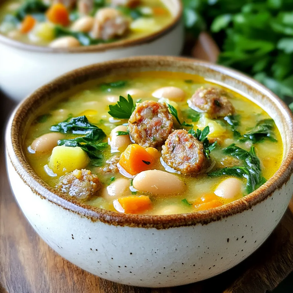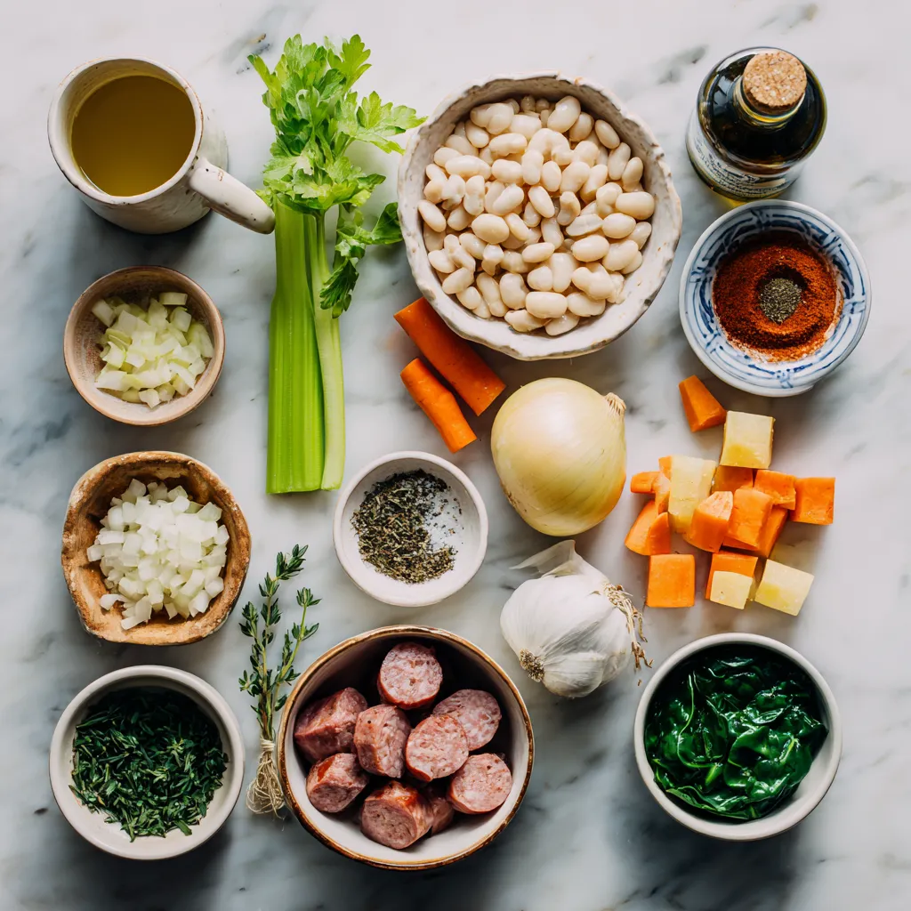 A hearty and creamy soup made with beans, sausage, and fresh vegetables.