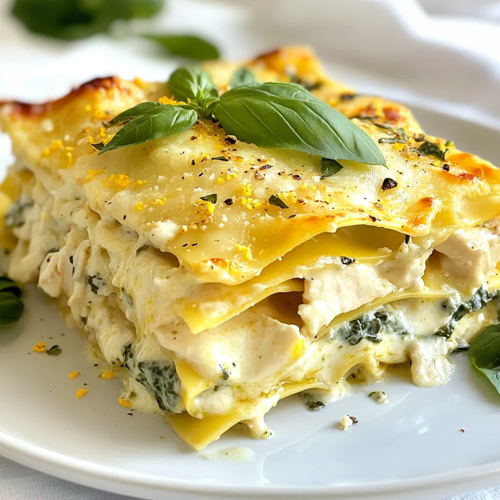 A delicious and creamy lasagna filled with shredded chicken, spinach, and a blend of cheeses, perfect for a comforting meal.