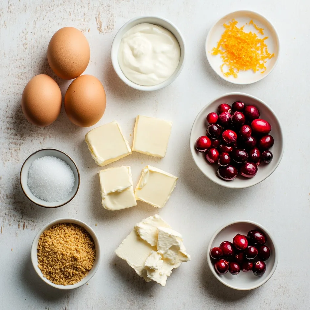 Create the cranberry topping: In a small saucepan over medium heat, combine the fresh cranberries, ½ cup of granulated sugar, 1 cup of water, and the orange zest. Cook for about 10 minutes or until the cranberries have burst and the mixture thickens to a sauce-like consistency. Remove from heat and let cool slightly.