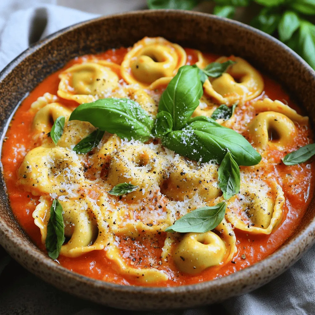 To make your dish look amazing, use fresh basil as a garnish. Sprinkle chopped basil on top right before serving. You can also add grated Parmesan for a nice finish. Serve in a wide, shallow bowl to show off the colorful sauce and tortellini. A drizzle of olive oil adds a touch of shine, making the meal even more appealing.