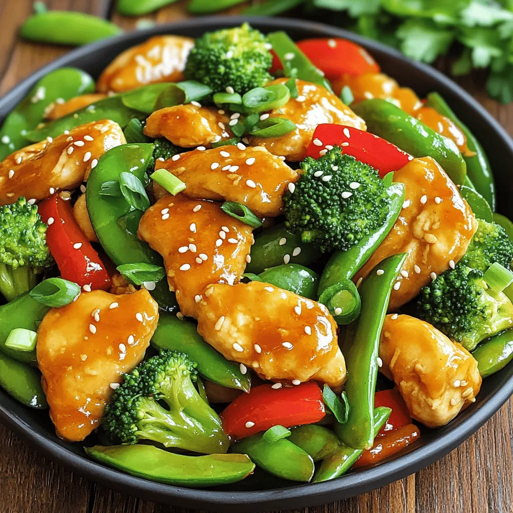 - 1 lb (450g) chicken breast, thinly sliced - 2 tablespoons soy sauce - 2 tablespoons cornstarch - 1 tablespoon olive oil - Juice and zest of 1 large orange - 1 tablespoon honey - 1 teaspoon fresh ginger, finely grated - 3 cloves garlic, minced - 1 red bell pepper, thinly sliced - 1 cup broccoli florets - 1 cup snap peas - Salt and freshly ground pepper to taste - Green onions, thinly sliced - Toasted sesame seeds - Skillet or wok - Mixing bowls - Measuring cups and spoons Gather these items before you start cooking. The chicken breast gives a nice base, while the fresh veggies add color and crunch. Orange juice and zest brighten the dish, and soy sauce with honey brings the sweet and salty balance. Don’t skip the garnishes. Green onions and sesame seeds add a pop of flavor and texture. 1. Marinate the chicken with soy sauce and cornstarch: Start by slicing 1 pound of chicken breast into thin strips. In a mixing bowl, combine the chicken with 2 tablespoons of soy sauce, 2 tablespoons of cornstarch, and a pinch of salt and pepper. Mix it well until all pieces are coated. Cover the bowl and let it sit for at least 15 minutes. This step makes the chicken tender and flavorful. 2. Prepare the orange sauce mixture: Take a separate bowl and whisk together the juice and zest from 1 large orange, 1 tablespoon of honey, 1 teaspoon of grated ginger, and 3 minced garlic cloves. This sauce will give your stir fry a bright, sweet flavor. 3. Sauté the marinated chicken: Heat 1 tablespoon of olive oil in a large skillet over medium-high heat. Once the oil is hot, add the marinated chicken in a single layer. Cook for about 4-5 minutes until the chicken is golden brown. Make sure to stir it occasionally. When done, take the chicken out and set it aside on a plate. 4. Stir-fry the vegetables: In the same skillet, add sliced red bell pepper, 1 cup of broccoli florets, and 1 cup of snap peas. Stir-fry these vegetables for about 3-4 minutes. You want them bright and slightly tender but still crisp. 5. Return the chicken to the skillet: After the vegetables are ready, add the cooked chicken back into the skillet with the veggies. 6. Pour and toss with the orange sauce: Now, pour the orange sauce over the chicken and veggies. Toss everything gently to combine. Let it cook for an extra 2-3 minutes. This allows the sauce to coat the chicken and vegetables nicely. Adjust seasoning with salt or pepper if needed. Enjoy the vibrant flavors and colors of your orange glazed chicken stir fry! - Marination time is key. Letting the chicken sit for at least 15 minutes helps it soak up flavor. This step also makes the chicken more tender. - Cook at the right temperature. Use medium-high heat to get a nice sear on the chicken. This helps lock in juices and adds a great taste. - Adjust seasoning to your taste. After cooking, taste the stir fry and add more salt or pepper if needed. - Use fresh ingredients. Fresh veggies and a ripe orange make a big difference in flavor. They add brightness and crunch to your dish. - Pair this stir fry with rice or quinoa. Both options soak up the sauce well and make your meal filling. - This dish is perfect for meal prep. You can make a big batch and enjoy it throughout the week. Just store in the fridge. {{image_4}} You can switch the chicken for shrimp or tofu. Shrimp cooks fast and adds a nice flavor. Tofu is a great choice for a plant-based meal. You can marinate the tofu just like chicken for extra taste. If you prefer beef, use thin slices of flank steak. For pork, try tenderloin or pork chops. Feel free to use any seasonal produce you like. Zucchini, bell peppers, or asparagus can work well. Adding mushrooms gives a nice, earthy taste. Carrots add a sweet crunch and color to the dish. You can mix your favorite veggies for a colorful stir fry. This dish is flexible, so use what you have on hand. Change up the sweetener in your sauce for fun. You can use maple syrup or agave for a twist. If you like heat, add some chili flakes or fresh chili. Garlic can boost the flavor even more. Try adding a splash of rice vinegar for tang. These changes can make the dish feel new and exciting. - Refrigerating leftovers: Store any leftover orange glazed chicken stir fry in an airtight container. It keeps well in the fridge for up to four days. Make sure it has cooled to room temperature before sealing. This helps avoid condensation, which can make the food soggy. - Freezing stir fry: If you want to save it for later, freeze the stir fry in a freezer-safe bag or container. It can last for up to three months. Try to remove as much air as possible before sealing. This prevents freezer burn and keeps the flavors intact. - Best practices for reheating in the skillet: To reheat, place the stir fry in a skillet over medium heat. Add a splash of water or broth to help steam and rehydrate the dish. Stir it occasionally until it’s hot throughout. This method keeps the veggies crisp and tasty. - Microwave options: If you're in a hurry, use the microwave. Place the stir fry in a microwave-safe dish. Cover it with a microwave-safe lid or wrap, leaving a small vent. Heat in short bursts, stirring in between until it’s warm. This keeps the chicken from drying out. - How long it lasts in the fridge: The orange glazed chicken stir fry stays safe to eat for about four days in the fridge. Always check for any signs of spoilage before consuming. - Signs of spoilage: Look for changes in color, texture, or smell. If the chicken smells sour or the veggies look wilted, it’s best to throw it away. Trust your senses; they help keep you safe! You can pair this dish with several sides. Here are some great options: - Steamed white rice - Brown rice or quinoa - Noodles, like chow mein or rice noodles - A crisp green salad - Roasted vegetables These sides will complement the sweet and tangy flavors of your stir fry. Yes, you can make this stir fry in advance! Here are some tips: - Cook the chicken and vegetables, then store