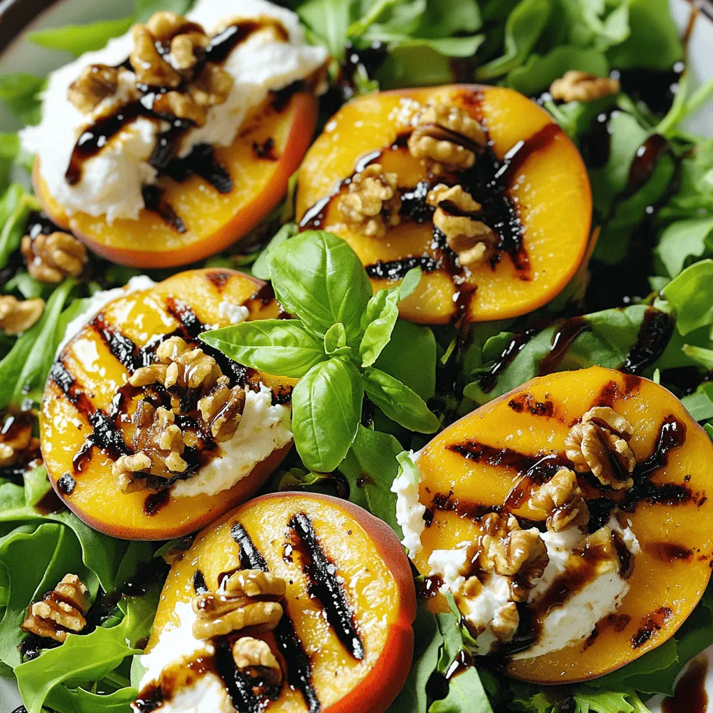 To create a delicious Grilled Peach Burrata Salad, you need these fresh ingredients: - 2 ripe peaches, halved and pitted - 200g burrata cheese, at room temperature - 4 cups mixed greens (a combination of arugula, spinach, and frisée) - 1/4 cup walnuts, lightly toasted and roughly chopped - 1/4 cup balsamic glaze for drizzling - 2 tablespoons extra virgin olive oil - Sea salt and freshly cracked black pepper, to taste - A handful of fresh basil leaves, for garnish These ingredients combine to create a fresh and flavorful treat. The juicy peaches add sweetness, while the creamy burrata adds richness. The mixed greens offer a crisp base, and toasted walnuts provide a nice crunch. Balsamic glaze adds a tangy touch that ties everything together. The sea salt and black pepper enhance all the flavors. Fresh basil elevates the dish with its aromatic notes. Enjoy this salad as a light meal or a side dish. First, preheat your grill to medium-high heat. This step is key for perfect grilling. A hot grill gives the peaches nice char marks. While the grill heats up, take your ripe peaches. Lightly brush the cut sides with extra virgin olive oil. This helps them grill evenly and adds flavor. Then, sprinkle a pinch of sea salt and a few cracks of black pepper on the peaches. This seasoning enhances their natural sweetness. Now, it's time to place the peaches on the grill. Set them cut side down on the grates. Grill the peaches for about 4 to 5 minutes. You want to see beautiful char marks. The peaches should feel slightly tender when you touch them. If they feel too soft, they may be overcooked. While the peaches are grilling, grab a large bowl. Add the mixed greens to create a fresh base. Once the peaches are ready, remove them from the grill. Let them cool for a few minutes. Slice the grilled peaches into wedges for easier mixing. Now, gently add the sliced peaches and toasted walnuts to the greens. Toss everything together to combine. Next, take the burrata cheese. Tear it into rustic pieces and place it on top. This creamy cheese is the star of the salad. Drizzle the balsamic glaze over everything. Season your salad with more sea salt and black pepper to taste. Finally, add fresh basil leaves for a pop of color and flavor. Serve immediately and enjoy the warm peaches with the creamy burrata! How do I check for ripeness? To find ripe peaches, look for a slight give when you press them. The skin should also have a rich color. Avoid peaches that feel hard or have dark spots. Ripe peaches will taste sweeter and grill better. How can I avoid sticking on the grill? Brush the cut sides of peaches with olive oil. This step helps to prevent sticking. Make sure your grill is hot before adding the peaches. Place them cut side down for grilling. This method creates a lovely char and makes them easier to flip. What are ideal pairings with the salad? This salad pairs well with grilled chicken or shrimp for added protein. A glass of chilled white wine also complements the flavors nicely. For a fresh twist, serve with a side of crusty bread. How should I plate for presentation? Arrange the mixed greens on a large plate. Place the grilled peach slices on top, followed by the burrata. Drizzle balsamic glaze over the salad. Finish with a sprinkle of walnuts and fresh basil for color and texture. How can I adjust seasoning to taste? Start with sea salt and black pepper. Taste as you go. You can always add more, but it’s hard to take away. If you like heat, consider adding a pinch of red pepper flakes. What are recommendations for balsamic alternatives? If you don’t have balsamic glaze, try using lemon juice or red wine vinegar. These options add a nice tang. Honey or maple syrup can also enhance sweetness if you prefer. {{image_4}} You can make this salad heartier by adding protein. Grilled chicken or shrimp work great. Just season and grill them alongside the peaches. Prosciutto is another tasty option. Its savory flavor complements the sweet peaches perfectly. Burrata is creamy and rich, but you can try other cheeses. Goat cheese adds a tangy touch. Feta brings a salty kick. If you're looking for vegan options, try cashew cheese or tofu. Both can mimic burrata's texture and taste well. Change up the fruits based on what's in season. Strawberries or figs can add new flavors. You can also swap mixed greens for seasonal options. Kale or arugula can add a nice twist. Adapting to what's fresh keeps the salad exciting. To store any leftover salad, place it in an airtight container. This keeps the salad fresh. If you have leftover peaches, keep them in a separate container. This prevents sogginess. You can also store burrata in its original container. Just cover it tightly. - Use a clean spoon for serving to avoid contamination. - Store the salad in the fridge for up to two days. You can prepare parts of this salad ahead of time. Slice the peaches and grill them in advance. Store them in a container with a lid. You can also wash and dry the greens. Keep them in a bag with paper towels for freshness. Assemble the salad just before serving. This keeps the greens crisp and vibrant. Add the burrata just before you eat. This way, it stays creamy and soft. If you store the salad properly, it lasts about two days. Check for signs of spoilage. If the greens look limp or brown, toss them. If the burrata smells sour or looks off, it’s best to discard it. Remember, freshness is key for the best taste. Always trust your senses when checking for spoilage. Burrata cheese is a creamy delight. It has a soft outer shell made of mozzarella. Inside, it holds a rich, creamy filling. This unique texture makes it a favorite in many dishes. Compared to mozzarella, burrata is creamier and richer. Mozzarella is firmer and less creamy. You can enjoy burrata fresh on salads or with bread. Its mild flavor pairs well with many ingredients. You can use canned peaches, but fresh is best. Canned peaches change the texture. They can be mushy and les