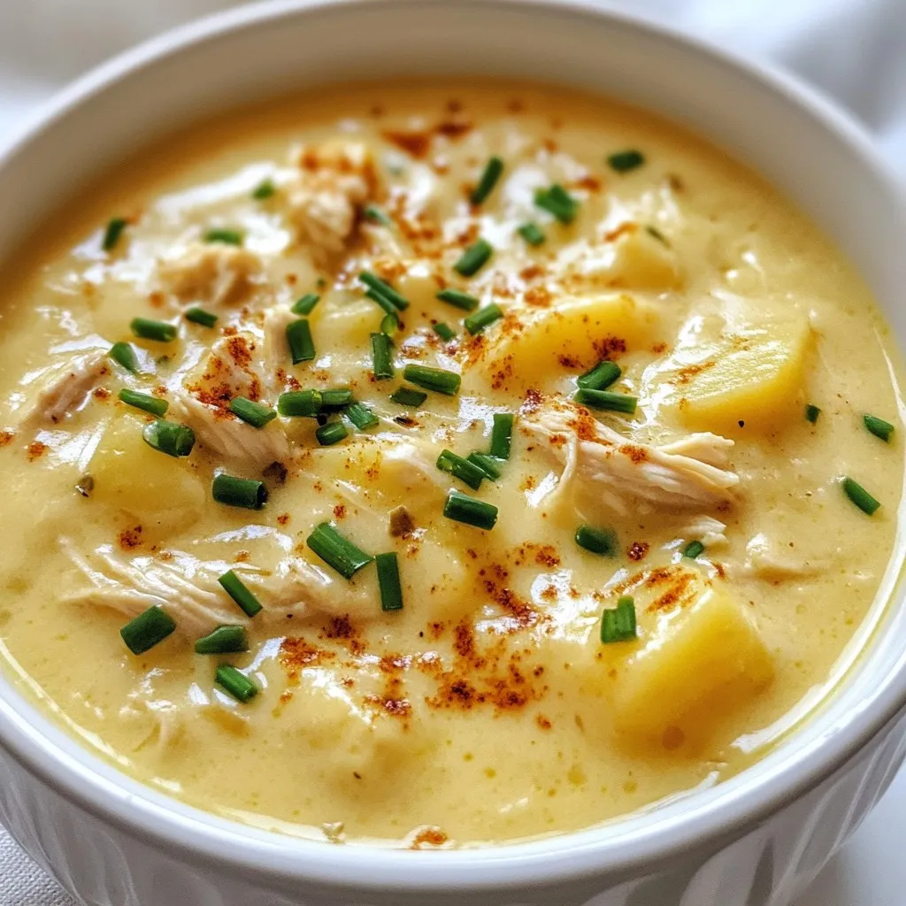 - 4 large russet potatoes, peeled and diced into 1-inch chunks - 1 cup cooked and shredded chicken breast, preferably rotisserie - 1 cup low-fat Greek yogurt, for creaminess - 1 large onion, chopped finely - 2 cloves garlic, minced for aromatic flavor - 4 cups low-sodium chicken broth, to control salt levels - 1 cup milk (or your preferred milk alternative, such as almond or oat milk) - 1 teaspoon dried thyme, to enhance flavor - 1 teaspoon smoked paprika, for a hint of smokiness - Salt and pepper to taste - Fresh chives, chopped finely (for a vibrant garnish) This creamy potato soup packs a punch with protein. Each serving is rich in essential nutrients. The shredded chicken provides lean protein, while Greek yogurt adds creaminess and more protein. The potatoes give you carbs for energy, and the broth keeps it light. Overall, it's a balanced meal that fills you up. When selecting potatoes, look for firm and smooth ones. Avoid any that have dark spots or blemishes. For chicken, rotisserie is great, but ensure it's fresh and well-cooked. The Greek yogurt should be thick and creamy, so check the label for quality. Choose low-sodium chicken broth to control the salt. Fresh herbs like chives should look vibrant and green, which adds a nice touch to your final dish. {{ingredient_image_2}} Start by heating a drizzle of olive oil in a large pot over medium heat. Add the chopped onion and minced garlic. Sauté them until the onion is soft and clear, which takes about 3 to 4 minutes. Stir often to keep them from sticking. Next, add the diced russet potatoes into the pot. Pour in 4 cups of low-sodium chicken broth. Turn the heat up until the mix boils. Once it reaches a boil, lower the heat and let it simmer for 15 to 20 minutes. You want the potatoes to be soft enough to pierce with a fork. After cooking, it’s time to blend the soup. If you have an immersion blender, use it directly in the pot. Blend until the soup is smooth and creamy. If you only have a countertop blender, let the soup cool for a bit. Then blend it in batches. Be careful to avoid splattering. Once it’s all pureed, return the soup back to the pot if you used a countertop blender. Now, mix in 1 cup of low-fat Greek yogurt and 1 cup of milk. The yogurt adds a rich creaminess. Stir in the cooked shredded chicken, dried thyme, and smoked paprika. Season with salt and pepper to your taste. Gently heat the soup on low until it's warm. Avoid boiling it again. Taste the soup and adjust the salt or pepper if needed. If you like a thinner soup, add more broth or milk until you reach the right thickness. Finally, serve the soup in bowls and sprinkle fresh chives on top for color and flavor. Enjoy your hearty meal! To boost the protein in your creamy potato soup, add more chicken. I like using shredded rotisserie chicken for flavor and ease. You can also mix in some cooked lentils or chickpeas. These legumes pack a protein punch without changing the taste. If you're feeling fancy, try adding a scoop of protein powder into the mix. Just blend it in with the Greek yogurt for a smooth texture. Having the right tools makes cooking easier and more fun. Here are some must-haves for this recipe: - A large pot for cooking the soup. - An immersion blender for a creamy finish. - A sharp knife to chop the veggies. - A cutting board for safety. - Measuring cups to keep the portions right. - A ladle for serving the soup. These tools help you work efficiently and enjoy the cooking process. Even simple recipes can have hiccups. Here are some common mistakes to watch for: - Don’t skip the sautéing step. Cooking the onion and garlic first adds great flavor. - Avoid using too much salt early on. You can always add more later. - Don't rush the blending. Ensure the soup is cool enough if using a countertop blender. This prevents splatter. - Be careful when adding milk or yogurt. Stir it in slowly. This keeps the soup creamy and prevents curdling. Keeping these tips in mind will help you create a delicious soup that you will love. Pro Tips Use Fresh Ingredients: Opt for fresh potatoes and high-quality chicken to enhance the flavor and texture of your soup. Control the Creaminess: Adjust the amount of Greek yogurt and milk based on your desired creaminess; you can always add more for a richer soup. Flavor Variations: Experiment with different herbs and spices, such as rosemary or curry powder, to customize the flavor profile to your liking. Storage Tips: This soup can be stored in the refrigerator for up to 3 days. Reheat gently on the stove to maintain its creamy consistency. {{image_4}} You can easily make this soup vegetarian. Instead of chicken, use cooked lentils or chickpeas. These options add protein and fiber. Swap the chicken broth for vegetable broth. This keeps the soup rich and flavorful. You can also add some nutritional yeast for a cheesy flavor. To make the soup dairy-free, replace Greek yogurt with coconut yogurt. It provides creaminess without dairy. Use almond milk or oat milk instead of regular milk. This gives you a smooth texture. Check labels to make sure they are unsweetened. For more nutrition, add extra veggies. You can include carrots, celery, or spinach. Chop them small so they cook well. Add them with the potatoes for a hearty soup. You can also try kale or broccoli for a twist. These veggies add color and flavor while boosting health benefits. To store your leftover soup, let it cool first. Then, transfer it to airtight containers. This keeps it fresh and tasty. You can keep the soup in the fridge for up to three days. Be sure to label the container with the date. This way, you’ll know when to enjoy it again. You can freeze this soup for longer storage. Pour the cooled soup into freezer-safe containers. Fill them only ¾ full to allow for expansion. Seal tightly and store in the freezer for up to three months. When you're ready to eat, just pull it out and let it thaw in the fridge overnight. Reheat the soup on the stove fo