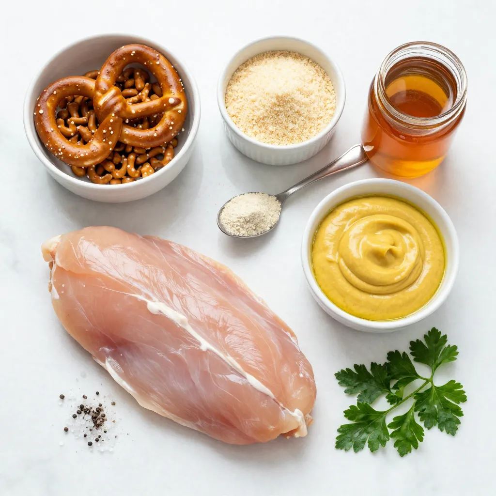 To make this dish, use a cup for the pretzels and honey. Measure the Dijon mustard with a quarter cup. Use two tablespoons for olive oil and one teaspoon for garlic powder. A pinch of salt and pepper to taste will help enhance the flavor. For the chicken, I suggest using boneless and skinless breasts for a tender bite.