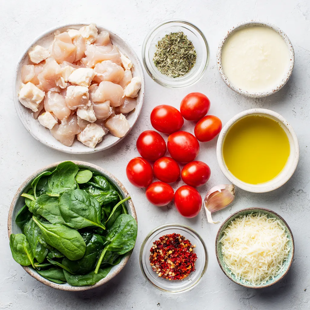 - 2 medium chicken breasts, diced into bite-sized pieces - 2 cups fresh spinach, roughly chopped - 1 cup cherry tomatoes, halved - 3 cloves garlic, minced - 1 teaspoon Italian seasoning blend - 1/2 teaspoon red pepper flakes (optional for heat) - 3 tablespoons extra virgin olive oil - 1/2 cup heavy cream - Salt and freshly cracked pepper to taste - Grated Parmesan cheese for garnish You will need: - A large skillet - A cutting board - A sharp knife - A spatula or wooden spoon - Measuring spoons - A serving dish This recipe serves 2 people. Here’s the nutritional breakdown per serving: - Calories: 550 - Protein: 40g - Fat: 39g - Carbohydrates: 8g - Fiber: 2g - Net Carbs: 6g This dish is great for anyone on a keto diet. The high protein and healthy fats keep you full. Plus, the low carbs fit perfectly into your meal plan. Enjoy the mix of flavors while staying on track! {{ingredient_image_2}} 1. Heat 2 tablespoons of olive oil in a large skillet over medium heat. 2. Add diced chicken. Season with salt, pepper, and Italian seasoning. 3. Sauté chicken for 6-8 minutes until golden brown and cooked through. 4. Remove chicken from the skillet and set aside on a plate. 5. Add the last tablespoon of olive oil to the same skillet. 6. Toss in minced garlic and optional red pepper flakes. 7. Sauté for 1 minute until garlic is fragrant. 8. Add halved cherry tomatoes and cook for 2-3 minutes. 9. Add chopped spinach and stir until it wilts, about 1-2 minutes. 10. Reduce heat to low and pour in heavy cream. Stir well. 11. Bring the cream to a gentle simmer. 12. Return cooked chicken to the skillet. Stir to combine. 13. Simmer for an additional 2-3 minutes to meld flavors. 14. Taste and adjust seasoning with salt and pepper. 15. Remove from heat and serve immediately. 16. Garnish with freshly grated Parmesan cheese. - Prep time: 10 minutes - Total cooking time: 25 minutes - This recipe serves 2 people. Enjoy it as a main dish on a weeknight! To make this dish stand out, use fresh ingredients. Fresh spinach and ripe tomatoes bring great flavor. Cut the chicken into small pieces for even cooking. Make sure the skillet is hot before adding the chicken. This helps it brown nicely. Sauté the chicken until it's golden and no longer pink inside. Remove it from the skillet to keep it juicy. For extra flavor, use fresh garlic. It gives a nice kick to the dish. Adding red pepper flakes adds heat, but it's optional. You can also try fresh herbs like basil or parsley. They brighten the meal. Drizzling a bit of lemon juice before serving can enhance the taste. Finally, generous Parmesan cheese on top adds richness. Avoid crowding the skillet with chicken. This can cause steaming instead of browning. If you skip the resting time for chicken, it may dry out. Don’t overcook the spinach; it should just wilt. Lastly, taste your dish before serving to adjust salt and pepper. This ensures the best flavor. Pro Tips Perfectly Cooked Chicken: Ensure your chicken is cooked through by using a meat thermometer; it should read 165°F (75°C) in the thickest part. Fresh Spinach: Use fresh spinach for better flavor and texture; wilted or frozen spinach can make the dish watery. Customize the Heat: Adjust the amount of red pepper flakes based on your heat preference; start with a pinch and add more if you like it spicy. Serving Suggestions: Pair this dish with a side salad or cauliflower rice for a complete keto meal. {{image_4}} If you want to lower the carbs, swap heavy cream for unsweetened coconut milk. This change still gives a creamy texture while keeping it keto-friendly. You can also use cauliflower rice instead of traditional rice. It’s a great way to soak up the sauce. Feel free to add more veggies for extra flavor. Bell peppers, zucchini, or mushrooms work well here. You might like to include some cooked bacon for an extra crunch. Just sauté it before adding the chicken. This recipe is very flexible! For dairy-free options, use a non-dairy cream. Almond or cashew cream can replace heavy cream. If you're avoiding chicken, try shrimp or tofu. They absorb flavors well and provide a different protein source. Just make sure to adjust cooking times as needed. After enjoying your Keto Chicken Spinach Tomato Skillet, let it cool to room temp. Place leftovers in an airtight container. Store in the fridge for up to three days. Make sure to keep it sealed to keep flavors fresh. To reheat, use a skillet over medium heat. Add a splash of water or broth to keep it moist. Heat until warm, stirring often. You can also microwave it for 1-2 minutes. Make sure to check that it’s hot all the way through. If you want to freeze, place the cooled dish in a freezer-safe container. It can last up to three months. When ready to eat, thaw it in the fridge overnight. Reheat as mentioned above. Avoid refreezing after it has been thawed. A keto diet is low in carbs and high in fats. It helps your body enter a state called ketosis. In ketosis, your body burns fat for energy. This can lead to weight loss and more energy. You eat foods like meats, fish, eggs, nuts, and healthy fats. You avoid grains, sugar, and most fruits. It’s simple but needs careful planning. Yes, you can use frozen spinach or tomatoes. They are convenient and still healthy. Frozen spinach can be added directly to the skillet. Just make sure to drain excess water before cooking. Frozen tomatoes work well, too. They may change the texture, but the taste stays great. To make this dish dairy-free, swap heavy cream for coconut milk. Coconut milk gives a creamy texture without dairy. You can also use almond milk, but it may not be as creamy. Skip the Parmesan cheese or use a dairy-free cheese instead. This keeps the dish tasty and suitable for dairy-free diets. You can serve this dish with a fresh salad. A simple green salad with olive oil works well. You can also pair it with cauliflower rice. Cauliflower rice is low in carbs and adds a nice texture. For a heartier option, s