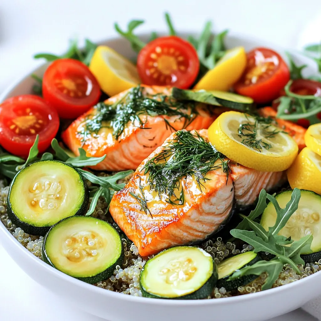 When assembling your bowls, think outside the box. Layer the quinoa, then add the salmon. Top with roasted veggies and a handful of fresh greens. Drizzle extra lemon-dill sauce on top for a burst of flavor. You can also use avocado slices for creaminess.