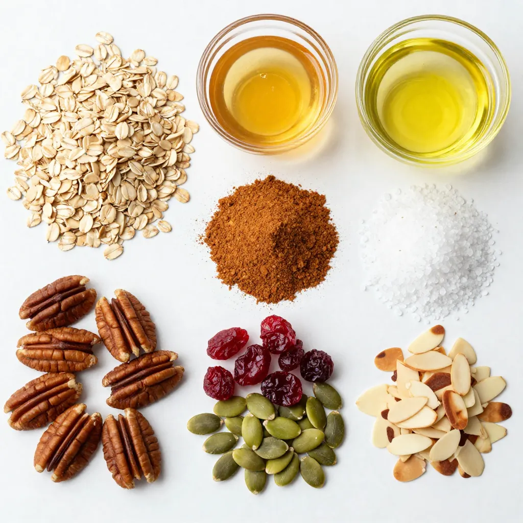 - 2 cups old-fashioned rolled oats - 1 cup pecans, coarsely chopped - 1/2 cup pure maple syrup - 1/4 cup coconut oil, melted and slightly cooled These main ingredients come together to create a tasty and healthy snack. The oats provide fiber, while pecans add crunch and healthy fats. The maple syrup gives natural sweetness, and coconut oil helps bind everything. - 1/2 teaspoon ground cinnamon - 1/4 teaspoon sea salt - 1 cup dried cranberries or raisins (or a mix of both) - 1/4 cup pumpkin seeds (optional) - 1/4 cup sliced almonds (optional) You can personalize your granola with these optional ingredients. Ground cinnamon adds warmth and flavor. Sea salt enhances the sweetness. Dried fruit brings a chewy texture. Pumpkin seeds and sliced almonds add even more crunch. You can mix and match to create your perfect blend! {{ingredient_image_2}} - Preheat the oven and prepare the baking sheet: Set your oven to 350°F (175°C). Line a large baking sheet with parchment paper. This helps keep the granola from sticking. - Mix dry ingredients in a bowl: In a big mixing bowl, add 2 cups of rolled oats, 1 cup of chopped pecans, 1/2 teaspoon of cinnamon, and 1/4 teaspoon of sea salt. If you like, add 1/4 cup of pumpkin seeds and 1/4 cup of sliced almonds. Stir everything well. - Whisk wet ingredients until smooth: In another bowl, mix 1/2 cup of maple syrup and 1/4 cup of melted coconut oil. Whisk until it looks smooth and well-blended. - Combine mixtures and spread on the baking sheet: Pour the wet mixture over the dry ingredients. Stir gently until every piece is coated and shiny. - Bake and stir halfway through for even cooking: Spread the mixture on the lined baking sheet. Bake for 20-25 minutes. Halfway through baking, pull it out and stir to cook evenly. Keep an eye on it to avoid burning. You want a nice golden-brown color. - Cool and add dried fruits: After baking, take it out of the oven and let it cool completely on the baking sheet. This helps it form crunchy clusters. Once cool, mix in 1 cup of dried cranberries or raisins for sweetness. - Store granola in an airtight container. This keeps it fresh and crunchy. - Glass jars or plastic containers work well. Make sure they seal tightly. - Keep granola in a cool, dry place. Avoid heat and moisture to prevent sogginess. - Set your oven to 350°F (175°C) for perfect baking. - Stir the granola halfway to cook it evenly. This helps avoid burning. - To make clusters, press down the mixture on the baking sheet. The tighter the layer, the better the clusters. - Enjoy granola with yogurt or milk for a tasty breakfast. - Mix it into smoothies for added crunch and flavor. - Sprinkle granola on salads for a fun texture and taste. - Use it as a topping for desserts like ice cream or fruit salad. Pro Tips Use Fresh Ingredients: Always opt for the freshest nuts and dried fruits for the best flavor and nutrition. Stale ingredients can significantly affect the taste of your granola. Customize Your Nuts: Feel free to substitute pecans with your favorite nuts like walnuts or hazelnuts. Each nut brings a unique flavor and texture to the granola. Experiment with Spices: Besides cinnamon, try adding a pinch of nutmeg or vanilla extract for a different flavor profile. Spices can elevate the taste and aroma of your granola. Make It Clumpier: If you prefer clumpy granola, press the mixture down firmly on the baking sheet before baking. This helps create larger clusters as it bakes. {{image_4}} You can easily change up the nuts or seeds in this granola. If you want a nut-free option, try using sunflower seeds or hemp seeds. They add a nice crunch and flavor. You can also swap pecans for walnuts or almonds. Each nut brings a unique taste. For dried fruits, cranberries and raisins are classic choices. But you can use apricots, cherries, or figs for a twist. Just chop larger pieces into smaller bits. This helps them mix well with the granola. You can even add some dark chocolate chips for a sweet touch. Adding spices can take your granola to the next level. Try mixing in some nutmeg or ginger for warmth. A pinch of cardamom can add a lovely fragrant note as well. You might also consider adding a splash of vanilla extract. This gives a warm and inviting flavor that everyone loves. If you’re feeling adventurous, try infusing the granola with cocoa powder. This adds a rich chocolate flavor. You can mix in cocoa powder with the dry ingredients. This way, you create a chocolate maple pecan granola that’s hard to resist. Each serving of Maple Pecan Granola packs in great nutrition. You get about 200 calories, 5 grams of protein, and 4 grams of fiber. The oats are a wonderful source of whole grains. They help keep your heart healthy and your digestion smooth. Pecans are also a star ingredient. They are rich in healthy fats, which are good for your brain. They also provide zinc and magnesium. These nutrients support your immune system. The mix of cranberries adds antioxidants that fight free radicals in your body. If you need gluten-free snacks, this granola works well! Just choose certified gluten-free oats. This simple change keeps the recipe safe for gluten-sensitive folks. For those following a vegan diet, this recipe is easy to adapt. Maple syrup is already plant-based. Use coconut oil to avoid dairy. You can enjoy this tasty treat without any animal products. How long does homemade granola last? Homemade granola lasts about two weeks if stored correctly. Keep it in an airtight container to keep it fresh. You can also freeze it for up to three months. Just let it thaw at room temperature when you want to enjoy it. Can I use other sweeteners instead of maple syrup? Yes, you can use honey, agave nectar, or brown sugar. Each option adds a different taste. Maple syrup gives a unique flavor that pairs well with pecans, but feel free to experiment with your favorite sweeteners. What are the best ways to enjoy Maple Pecan Granola? You can eat it as a snack right out of the j