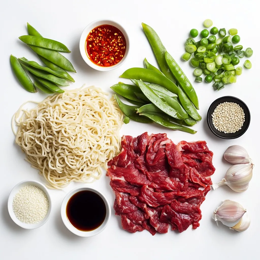 A flavorful dish featuring tender beef, egg noodles, and vibrant vegetables, all tossed in a spicy sauce.