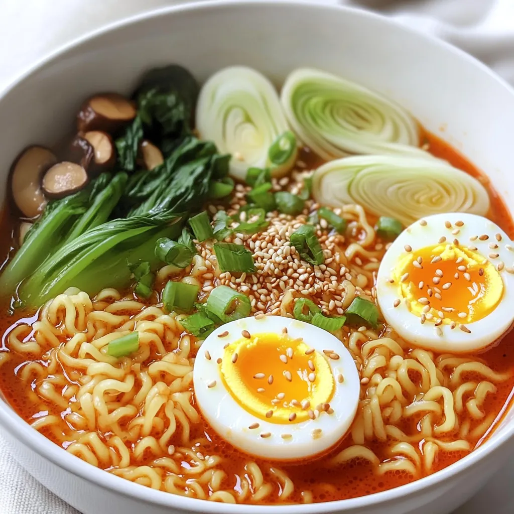 Fresh vegetables make this ramen vibrant. Baby bok choy adds crunch and nutrition. Shiitake mushrooms give a meaty texture that complements the noodles. Green onions not only add color but also enhance the flavor. A soft-boiled egg adds creaminess, and sesame seeds bring a lovely finish.