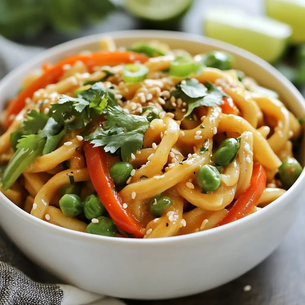 A delicious and easy-to-make dish featuring udon noodles tossed in a creamy peanut sauce with fresh vegetables.