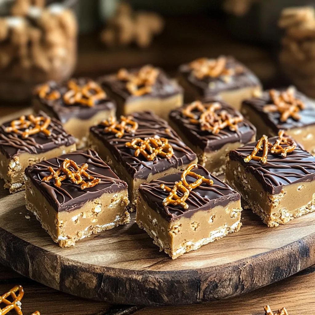 When serving, arrange the bars on a nice platter. This makes them look more inviting. You can add whole pretzels standing up for a fun look. A light drizzle of melted chocolate on top makes it even prettier.