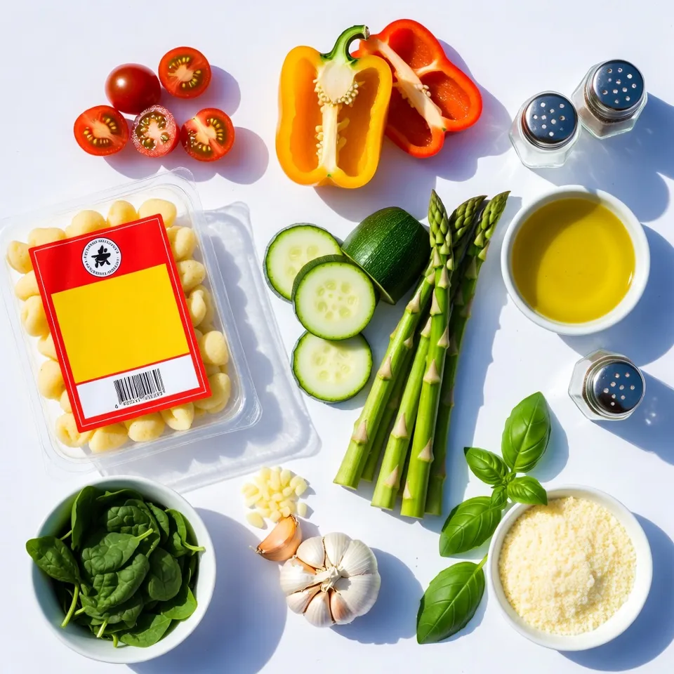 Gather these ingredients to make your one-pan gnocchi primavera. The gnocchi are the star here, soft and fluffy. Cherry tomatoes add a sweet burst. The bell pepper gives crunch and color. Zucchini brings a mild taste that works well. Asparagus adds a nice green touch, while spinach wilts down to add more nutrients.