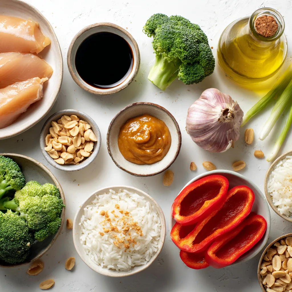 Don’t overlook the peanut sauce. It’s the star! The sauce has peanut butter, soy sauce, honey, rice vinegar, sriracha, and chicken broth. This mix makes a creamy, tangy sauce that coats the chicken and veggies perfectly.
