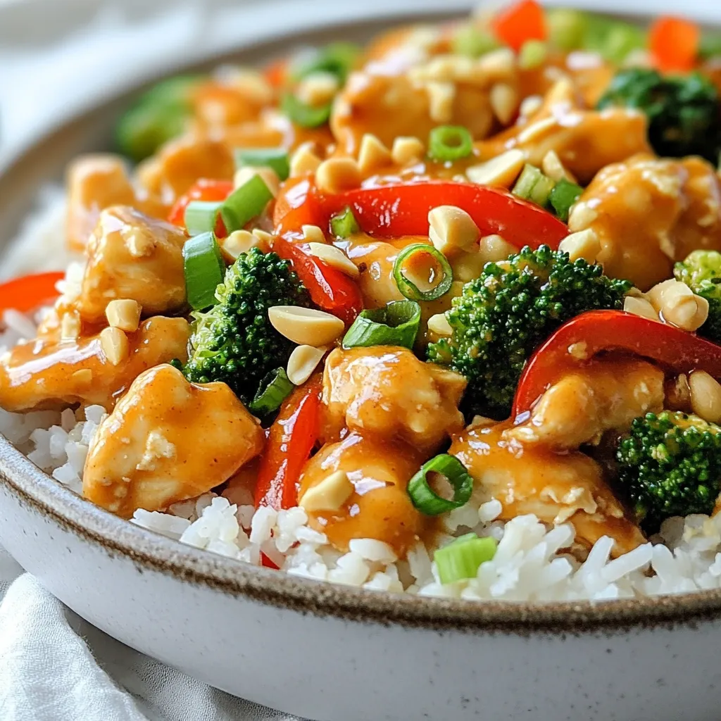 - 1 lb (450g) chicken breast, cut into bite-sized pieces - 2 tablespoons peanut oil - 1 medium onion, diced - 3 cloves garlic, minced - 1-inch piece of fresh ginger, grated - 1 red bell pepper, sliced into strips - 1 cup broccoli florets - ½ cup unsweetened creamy peanut butter - 2 tablespoons low-sodium soy sauce - 1 tablespoon honey (or maple syrup for a vegan option) - 1 tablespoon rice vinegar - 1 teaspoon sriracha (adjust to your spice preference) - ¼ cup chicken broth or water - 4 green onions, thinly sliced (for garnish) - Crushed peanuts (for garnish) - Cooked jasmine rice or quinoa (for serving) This dish shines because of its fresh ingredients. You need quality chicken for a tasty meal. I like to use chicken breast. Cut it into bite-sized pieces for even cooking. You can't forget the vegetables. They add crunch and flavor. I use onion, garlic, ginger, red bell pepper, and broccoli. Each brings its own taste to the dish. Don't overlook the peanut sauce. It’s the star! The sauce has peanut butter, soy sauce, honey, rice vinegar, sriracha, and chicken broth. This mix makes a creamy, tangy sauce that coats the chicken and veggies perfectly. Make sure to have fresh green onions and crushed peanuts ready for garnish. They add a nice touch at the end. Serve the dish with jasmine rice or quinoa for a complete meal. {{ingredient_image_2}} - Heat the peanut oil in a large skillet over medium-high heat until it shimmers. - Carefully add the chicken pieces in a single layer. Sauté them for about 5-7 minutes, stirring now and then. Cook until the chicken turns golden brown and is fully cooked. Remove the chicken and set it aside on a plate. - In the same skillet, add the diced onion, minced garlic, and grated ginger. Cook for about 2-3 minutes. Stir often until the onion becomes translucent and smells great. - Next, add the sliced red bell pepper and broccoli florets. Stir and cook for another 5 minutes. This keeps the veggies tender but still a bit crisp. - In a medium bowl, whisk together peanut butter, soy sauce, honey, rice vinegar, sriracha, and chicken broth. Mix until smooth and well blended. - Bring the cooked chicken back to the skillet with the sautéed veggies. Pour the peanut sauce over everything. Gently stir to coat all the ingredients in the sauce. Allow it to cook for an extra 2-3 minutes until heated through. - Serve your peanut chicken skillet over a bed of jasmine rice or fluffy quinoa for a filling meal. - For a tasty garnish, sprinkle sliced green onions and crushed peanuts on top for extra flavor and crunch. To keep your chicken juicy, start with fresh, high-quality breast. Cut the chicken into bite-sized pieces for even cooking. I suggest marinating it briefly with soy sauce. This adds flavor and moisture. When you cook, make sure your skillet is hot. This helps to sear the chicken and lock in juices. You can adjust the spice level by adding more sriracha. If you want a milder dish, use less. Sriracha not only adds heat, but also depth. For a twist, try using different sauces. You can swap the peanut butter for almond butter for a new taste. Avoid overcrowding your skillet. If you add too much, the chicken may steam instead of sear. Cook in batches if needed. For your vegetables, time is key. Add them after the chicken is browned. Cook until they are tender but still crisp. This way, you keep the bright colors and nutrients. Pro Tips Use Fresh Ingredients: Fresh vegetables and chicken will enhance the flavors in this dish, making it even more delicious! Adjust Spice Levels: Feel free to modify the amount of sriracha based on your spice tolerance. You can also add chili flakes for extra heat. Peanut Butter Consistency: For a smoother sauce, use creamy peanut butter. If you prefer a chunkier texture, crunchy peanut butter can add an interesting twist. Meal Prep Friendly: This dish can be made in advance and stored in the refrigerator for up to 3 days. Just reheat and enjoy! {{image_4}} You can swap chicken for tofu or tempeh. Both options absorb flavors well. Choose firm tofu for a good texture. Cut it into bite-sized pieces. Cook it in the skillet until golden brown. For a vegan sauce, use maple syrup instead of honey. This keeps it plant-based while still sweet. Feel free to mix in various vegetables. Carrots and snap peas add crunch and color. Seasonal veggies like zucchini or bell peppers can also brighten the dish. Just chop them small to cook evenly. You can use whatever you have on hand. This way, you make it your own. For those avoiding nuts, you can make tasty substitutions. Try sunflower seed butter or tahini for the sauce. Both provide creamy textures without peanuts. You can also use chicken or turkey as protein options. This keeps the meal hearty and satisfying while being nut-free. To keep your leftover peanut chicken skillet fresh, store it in the fridge. Place it in an airtight container. This helps prevent it from drying out or absorbing odors. Leftovers will last for three to four days in the refrigerator. You can reheat your peanut chicken skillet in two ways: microwave or stovetop. For the microwave, place the dish in a safe bowl and cover it. Heat in short bursts, stirring between, until warm. For stovetop, use a skillet over medium heat. Add a splash of water or chicken broth to keep it moist. Stir until heated through. This helps maintain the food's texture and flavor. If you want to freeze your peanut chicken skillet, let it cool first. Then, place it in a freezer-safe container or a zip-top bag. Squeeze out the air to prevent freezer burn. It can stay in the freezer for up to three months. When you're ready to eat, thaw it in the fridge overnight. You can also use the microwave for a quick thaw. After thawing, reheat as mentioned above. This keeps the dish tasting fresh and delicious. To add more heat, use extra sriracha. Start with one teaspoon and taste. You can also include chopped fresh chilies, like jalapeños or bird's eye peppers. If