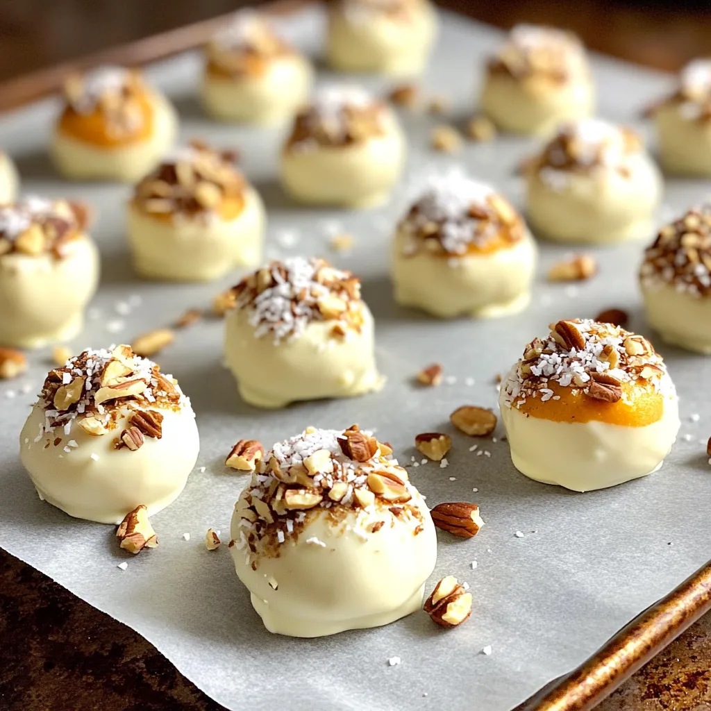 While the truffles chill, melt 1 cup of white chocolate chips. Use a microwave-safe bowl and heat in 30-second bursts. Stir between each time until smooth. Be careful not to overheat the chocolate. Once melted, take the truffles from the fridge. Dip each one into the white chocolate, ensuring they are fully coated. Let excess chocolate drip off before placing them back on the sheet. If you want, sprinkle with chopped nuts or shredded coconut right after dipping. Let the chocolate set either at room temperature or chill for 15 minutes in the fridge. Enjoy these treats chilled or at room temperature for the best taste!