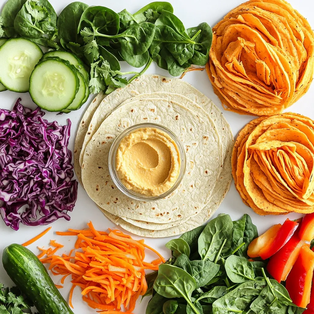 To make Rainbow Veggie Pinwheels, gather these vibrant ingredients. Start with large tortillas; whole wheat or spinach works great. Next, grab a cup of hummus. You can buy it or make it at home.