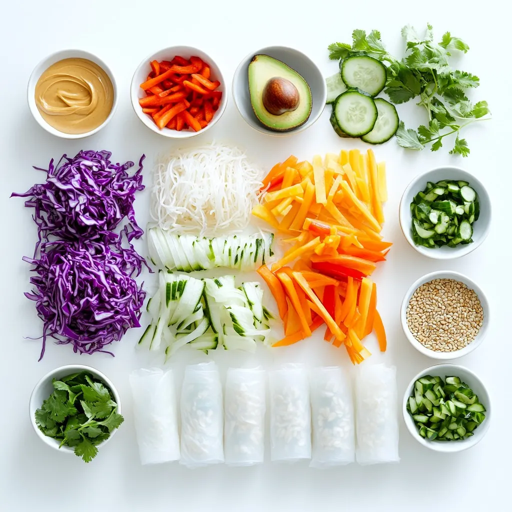 - 8 rice paper wrappers - 1 cup red cabbage, thinly shredded - 1 cup carrots, julienned - 1 cup cucumbers, julienned - 1 cup bell peppers (assorted colors), thinly sliced - 1 ripe avocado, sliced - 1 cup fresh mint leaves, gently rinsed - 1 cup fresh cilantro leaves, gently rinsed - 1/4 cup sesame seeds, toasted - 1/4 cup creamy peanut butter - 2 tablespoons low-sodium soy sauce - 2 tablespoons freshly squeezed lime juice - 1 teaspoon honey or agave syrup I love using fresh ingredients for my rainbow veggie spring rolls. Each color brings its own flavor and health benefits. You’ll need rice paper wrappers as your base. These wrappers are light and easy to use. They hold everything together and add a nice texture. For the veggies, I like to use red cabbage, carrots, cucumbers, bell peppers, and avocado. Each veggie adds crunch and color. Red cabbage is great for its crunch, and it looks beautiful. Carrots add sweetness, while cucumbers bring a refreshing taste. Bell peppers give a nice pop of color and flavor. Don't forget the creamy avocado for richness! Fresh herbs are key too. I use mint and cilantro for their bright flavors. They add freshness and make the rolls taste even better. Lastly, I sprinkle toasted sesame seeds on top for a nutty crunch. They also add a lovely visual touch. For the dipping sauce, I mix creamy peanut butter, low-sodium soy sauce, fresh lime juice, and honey or agave syrup. This sauce balances the fresh flavors of the spring rolls. It adds a bit of sweetness and tang, which is simply delicious. When you gather these ingredients, you set yourself up for a fun cooking experience. Enjoy the process of making these colorful rolls! {{ingredient_image_2}} Start by washing all your vegetables. This keeps them clean and safe to eat. Use a sharp knife to cut the vegetables into thin, even pieces. For carrots and cucumbers, julienne them into thin strips. Julienning makes them easy to roll and look nice. Shred the red cabbage into fine pieces for a crunchy texture. Thin slices of bell peppers add color and flavor. Next, soak the rice paper wrappers. Fill a shallow dish with warm water. It should be deep enough for the wrappers to fully submerge. Take one rice paper wrapper and dip it in the water for about 10-15 seconds. You want it soft but not too mushy. Remove it carefully and let it rest on a clean surface. Now it’s time to assemble your spring rolls. Place the soaked wrapper flat on a damp kitchen towel. This helps prevent sticking. In the center, layer your vegetable fillings. Start with the red cabbage, then add carrots, cucumbers, and bell peppers. Don’t forget avocado slices for creaminess. Add fresh mint and cilantro on top for a burst of flavor. Sprinkle toasted sesame seeds for crunch. To roll the spring roll, gently fold in the sides of the wrapper. Start rolling from the bottom, tucking in the fillings. Keep it tight as you roll up to the top. Make sure it seals well. Repeat this with the rest of the wrappers and fillings. Each roll should be colorful and packed with flavor! To make great spring rolls, the rolling technique is key. Start by soaking rice paper in warm water. This makes it soft and easy to work with. If the rice paper sticks, try placing it on a damp kitchen towel. It helps keep things from sticking. When you layer your fillings, keep them in the center. Start with red cabbage, then add carrots, cucumbers, bell peppers, and avocado. This ensures even distribution of flavors. Don't overstuff the wrapper. A small handful of each vegetable works best. For a beautiful display, arrange your spring rolls in a circle on a colorful platter. Place the dipping sauce in a small bowl at the center. This draws the eye and makes your dish pop. Garnish with fresh mint leaves around the platter. This adds color and a fresh scent. You can also sprinkle some toasted sesame seeds on top for added crunch. You can adjust the dipping sauce to match your taste. If you like it sweeter, add more honey or agave syrup. For a zestier flavor, squeeze in extra lime juice. If you're feeling adventurous, try different dipping sauces. Options like hoisin sauce or spicy sriracha can add a fun twist to your spring rolls. Pro Tips Fresh Ingredients: Always use the freshest vegetables and herbs to enhance the flavor and texture of your spring rolls. Perfect Soaking: Soak the rice paper just until it's pliable; over-soaking can make it too fragile to roll. Rolling Technique: Tuck the filling tightly as you roll to create a compact spring roll that holds its shape. Custom Dipping Sauce: Feel free to experiment with the dipping sauce by adding spices or different nut butters for a unique twist. {{image_4}} You can change the veggies in your spring rolls based on what you like. Use seasonal vegetables for the best taste. For example, try zucchini in summer or butternut squash in fall. Adding proteins can make your rolls heartier. You can include tofu for a vegetarian option or shrimp for seafood lovers. Both options give a nice twist to the classic recipe. Herbs and spices can change the taste of your spring rolls. Consider adding basil or cilantro for a fresh kick. A hint of ginger can also brighten the flavors. You can even incorporate sauces into the filling. Adding a bit of hoisin sauce or sriracha brings a fun zing to your rolls. It’s all about what flavors you enjoy the most! If you need gluten-free options, look for rice paper wrappers labeled as gluten-free. They work just as well for the rolls. For vegan sauces, use plant-based ingredients instead of dairy. For instance, swap creamy peanut butter with a nut-free alternative. This way, everyone can enjoy these tasty rolls! To keep leftover spring rolls fresh, store them in the fridge. I recommend using an airtight container. This method helps prevent them from drying out. You should also place a damp paper towel inside the container. This will help keep the rolls moist. The rolls can last up to three days when stored