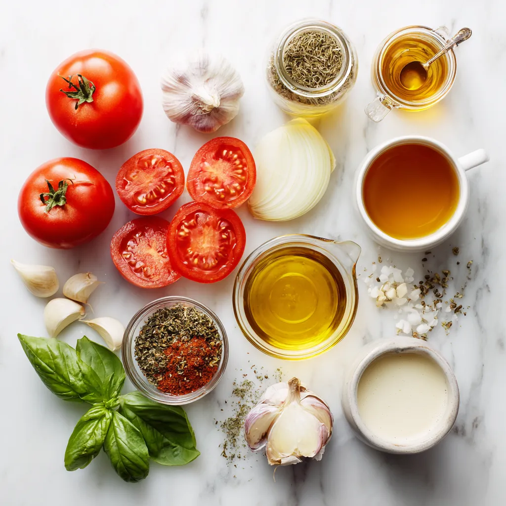 Use extra-virgin olive oil for its fruity flavor. Dried basil and oregano bring an earthy taste. Granulated sugar balances the acidity of tomatoes. Always season with sea salt and black pepper for a tasty finish.