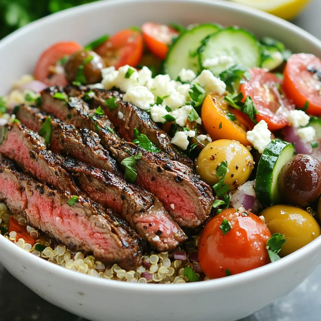• To assemble each bowl, start with a generous base of the quinoa salad mixture. Arrange the sliced steak artfully on top and finish with a sprinkle of crumbled feta cheese and a handful of chopped parsley for freshness.