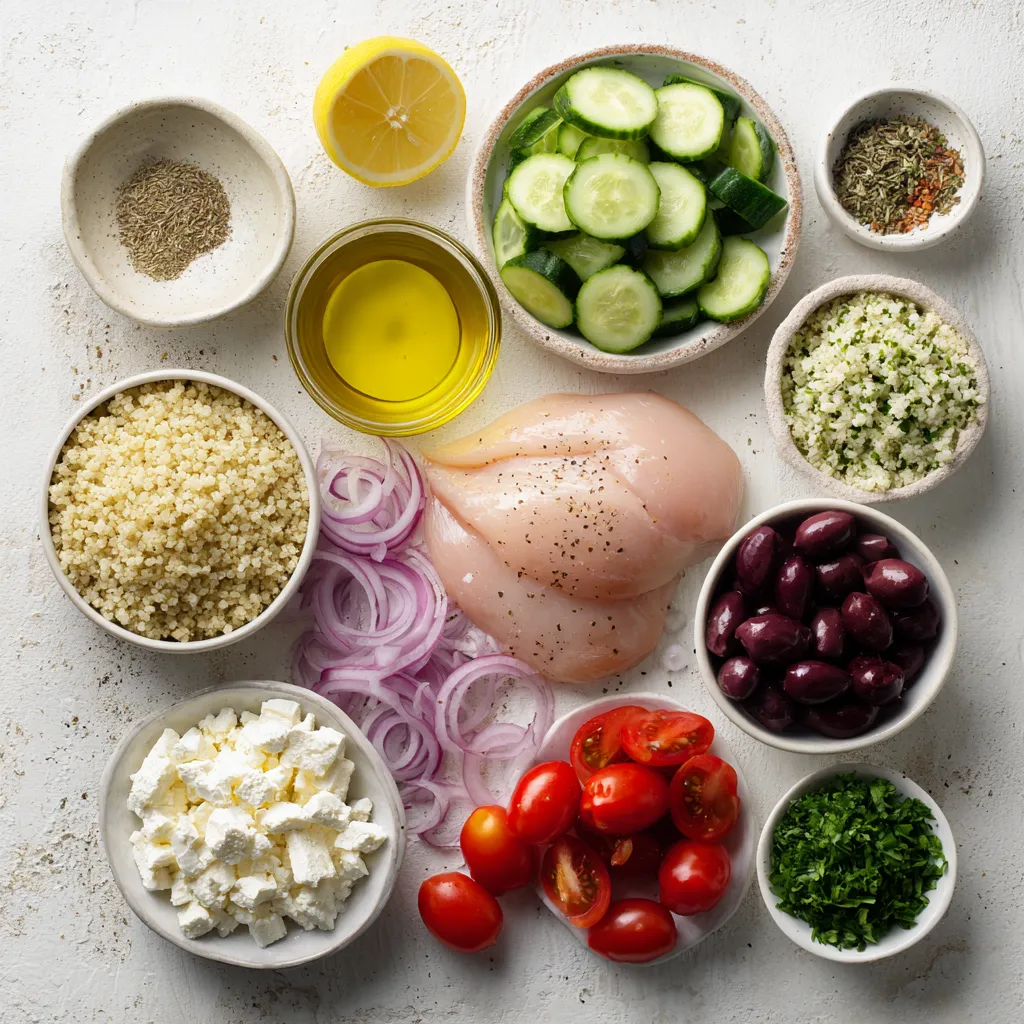 A refreshing and vibrant dish featuring marinated grilled chicken served over a bed of quinoa or couscous with fresh vegetables and feta cheese.