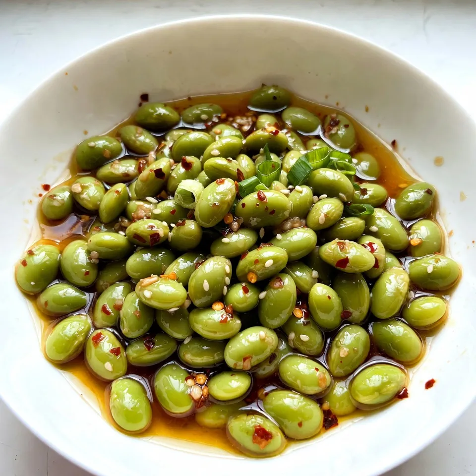 - 2 cups shelled edamame (fresh or frozen) - 3 tablespoons extra virgin olive oil - 4 cloves garlic, finely minced - 1 tablespoon red pepper flakes (or adjust to your spice preference) - 2 tablespoons low-sodium soy sauce - 1 tablespoon toasted sesame oil - 1 tablespoon freshly squeezed lemon juice - Sea salt, to taste These main ingredients create a bold and tasty dish. Edamame brings protein and a nice green color. Olive oil adds richness, while garlic gives depth and warmth. The red pepper flakes bring heat, so adjust them to your liking. Soy sauce adds umami, and sesame oil gives a nutty flavor. Lemon juice brightens everything up. - 2 green onions, thinly sliced (for garnish) - Toasted sesame seeds, for garnish Green onions add a sharp bite that contrasts well with the edamame. Sesame seeds provide a crunchy texture and nutty flavor. These garnishes make your dish look fancy and inviting. If you can't find edamame, you can swap in green peas. They offer a similar texture and taste. For olive oil, you can use canola oil or avocado oil. If you need a gluten-free option, use tamari instead of soy sauce. You can also adjust the spicy level by using less red pepper flakes or adding fresh chili for more heat. {{ingredient_image_2}} Start with shelled edamame. If you use frozen, boil them. Follow the package instructions. Usually, it takes about 4 to 5 minutes. They should be tender and bright green. Drain the edamame well and set them aside. This step is simple, but it sets the stage for flavor. Next, heat 3 tablespoons of extra virgin olive oil in a large skillet. Keep the heat at medium until the oil shimmers. Add 4 cloves of finely minced garlic. Sauté for about 1 minute. You want the garlic to smell great and turn golden. Be careful not to burn it. Then, add 1 tablespoon of red pepper flakes. Stir for another 30 seconds to enhance the flavor. Now, add the cooked edamame to the skillet. Pour in 2 tablespoons of low-sodium soy sauce and 1 tablespoon of toasted sesame oil. Toss everything together quickly. Make sure the edamame is well-coated in the spicy garlic mix. Drizzle 1 tablespoon of freshly squeezed lemon juice on top. Stir well and taste. Adjust sea salt if needed. Finally, transfer your dish to a serving plate. Garnish with thinly sliced green onions and toasted sesame seeds. Enjoy your colorful and tasty creation! To adjust the spice, you can change the red pepper flakes. Start with one teaspoon for a mild kick. If you love heat, add more flakes until you reach your desired level. You can also add a dash of hot sauce for extra flavor. Want more flavor? Try adding a splash of rice vinegar. It adds a nice tang. You can also mix in a teaspoon of honey for sweetness. This balance of flavors makes the dish pop. Fresh herbs like cilantro or basil can brighten the taste too. Serve your Spicy Garlic Edamame in a bright bowl. This makes the dish stand out. Use toothpicks for easy snacking. To show off your dish, sprinkle extra sesame seeds on top. A small bowl of chili oil on the side adds a fun touch and lets guests add more heat. Pro Tips Fresh Ingredients: Use fresh edamame whenever possible for the best flavor and texture. Frozen edamame is a good alternative if fresh is not available, but be sure to cook them properly. Adjusting Spice Levels: Feel free to adjust the amount of red pepper flakes based on your heat tolerance. Start with a small amount and gradually add more to find your perfect spice level. Perfectly Sautéed Garlic: Keep an eye on the garlic while sautéing; it can burn quickly. Remove it from heat as soon as it turns golden to avoid a bitter taste. Garnishing for Flavor: Don’t skip the garnishes! Green onions and toasted sesame seeds add not only a visual appeal but also a delightful crunch and extra flavor to the dish. {{image_4}} You can change the flavor of your spicy garlic edamame easily. Try adding lime juice instead of lemon. This will give a bright, zesty twist. For a sweet touch, mix in a teaspoon of honey or maple syrup. You could also use different oils, like chili oil, for a richer flavor. Experiment with herbs too! Fresh cilantro or parsley can add a nice touch. Want to make this dish heartier? Add protein like shrimp or chicken. Cook them in the skillet before adding garlic and edamame. Tofu is a great option for a plant-based boost. Simply cube it and sauté until golden. You can even sprinkle cooked bacon pieces on top for a smoky flavor. These additions will make your dish filling and tasty. This recipe is already vegan and can be gluten-free! Use tamari instead of soy sauce for a gluten-free option. Always check labels when buying sauces. For a nutty twist, add a splash of almond or peanut sauce. You can also include fresh veggies like bell peppers or snap peas to enhance nutrition. Enjoy your spicy garlic edamame with these simple tweaks! To keep your Spicy Garlic Edamame fresh, store leftovers in an airtight container. Make sure the dish cools to room temperature first. Place it in the fridge and enjoy it within three days for the best flavor. To reheat, you can use the microwave or stovetop. If using the microwave, heat for about 1-2 minutes. Stir halfway through to warm evenly. If you choose the stovetop, add a splash of water in a skillet and heat over low heat. Stir often until hot. You can freeze Spicy Garlic Edamame for later use. First, let it cool completely. Then, place it in a freezer-safe bag or container. Remove as much air as possible. It will stay fresh for up to three months. When ready to eat, thaw in the fridge overnight and reheat. Cooking frozen edamame takes about 4 to 5 minutes. Boil them in salted water until they are tender. Once cooked, drain the edamame well. This quick cook time keeps the beans bright and tasty. Yes, you can prepare Spicy Garlic Edamame ahead of time. Cook the edamame and mix in the garlic sauce. Store it in the fridge for up to two days. Reheat it in a skillet before serving. The flavors will blend 