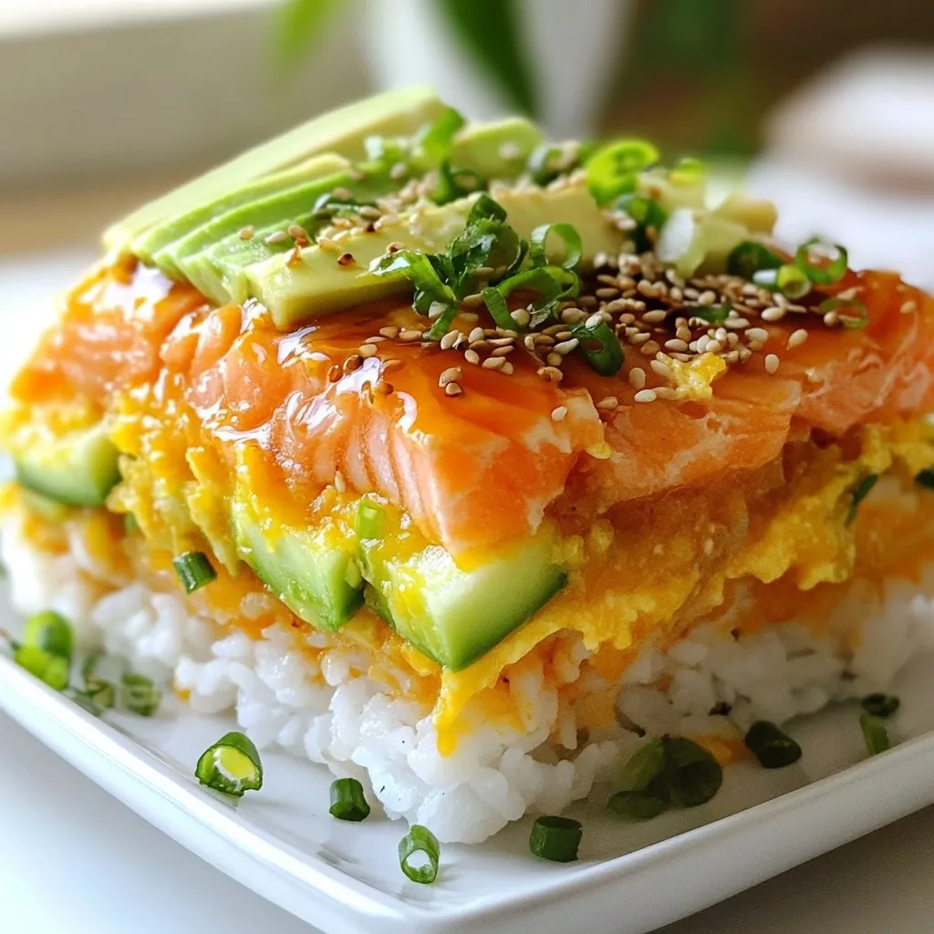 A delicious and easy-to-make sushi bake featuring spicy salmon and seasoned sushi rice, perfect for sharing.