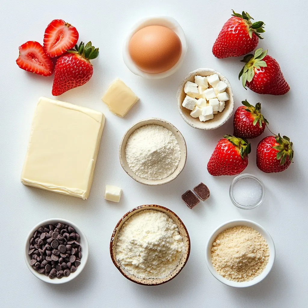 To make your strawberry cheesecake cookies, gather these simple ingredients: - 1 cup cream cheese, softened to room temperature - 1/2 cup unsalted butter, softened to room temperature - 1 cup granulated sugar - 1/2 cup packed brown sugar - 1 large egg - 1 teaspoon pure vanilla extract - 2 cups all-purpose flour - 1 teaspoon baking powder - 1/2 teaspoon baking soda - 1/4 teaspoon salt - 1 cup fresh strawberries, hulled and diced - 1/2 cup white chocolate chips (optional but recommended for extra sweetness) Each ingredient plays a key role in the cookie's flavor and texture. The cream cheese gives a rich base, while the butter adds softness. The sugars create sweetness and help with the cookie's golden edges. The egg acts as a binder, keeping everything together. Fresh strawberries bring a burst of flavor and color. If you choose to add white chocolate chips, they provide a creamy sweetness that complements the strawberries. Make sure your ingredients are at room temperature for the best results. This ensures a smooth batter and better mixing. Enjoy gathering these ingredients and get ready for a delightful baking experience! {{ingredient_image_2}} Start by preheating your oven to 350°F (175°C). Take a baking sheet and line it with parchment paper. This helps the cookies come off easily after baking. In a large bowl, add 1 cup of softened cream cheese and 1/2 cup of softened unsalted butter. Use an electric mixer on medium speed. Mix until the blend is smooth and creamy. This should take about 2-3 minutes. Next, add 1 cup of granulated sugar and 1/2 cup of packed brown sugar. Mix again until everything is fluffy and well combined. In another bowl, whisk together 2 cups of all-purpose flour, 1 teaspoon of baking powder, 1/2 teaspoon of baking soda, and 1/4 teaspoon of salt. Make sure these dry ingredients are well mixed. This step ensures your cookies rise nicely. Now, slowly add the dry mix to the wet mix. Stir gently until just combined. Be careful not to overmix! Next, fold in 1 cup of diced fresh strawberries and 1/2 cup of white chocolate chips, if you choose to use them. Use a spatula to mix gently, so you don’t break the strawberries apart too much. Using a cookie scoop or a tablespoon, drop rounded balls of dough onto your prepared baking sheet. Leave about 2 inches of space between each cookie. This space lets them spread while baking. Place the baking sheet in the oven and bake for 10-12 minutes. Look for light golden edges while the centers stay soft. Once the cookies are done, let them cool on the baking sheet for about 5 minutes. After that, transfer them to a wire rack. Allow them to cool completely. This step helps the flavors blend and the texture to set. Enjoy your strawberry cheesecake cookies fresh! To soften cream cheese, take it out of the fridge. Let it sit at room temperature for about 30 minutes. You can also microwave it. Place the cream cheese in a microwave-safe bowl. Microwave on low power for about 10-15 seconds. Check it often. You want it soft, not melted. Baking time can change based on your oven. Start checking the cookies at 10 minutes. If they look light brown on the edges, they are close to done. If they seem too soft, give them 1-2 more minutes. Remember, cookies firm up as they cool. Mixing well is key. Use an electric mixer to blend the cream cheese and butter until fluffy. When adding the sugars, mix until combined and fluffy again. Add the egg and vanilla, then beat until smooth. For the dry ingredients, fold gently. Overmixing can lead to tough cookies! Using pure vanilla extract makes a big difference. It adds depth to the cookie dough. Always add it after the egg. This ensures the flavors blend well. You can also try different extracts like almond for a fun twist! For a lovely presentation, arrange cookies on a nice platter. Dust them lightly with powdered sugar for a sweet touch. Add fresh strawberry slices next to the cookies. This makes the dish look bright and fun! It also enhances the strawberry flavor in each bite. Pro Tips Use Room Temperature Ingredients: Ensure that your cream cheese and butter are at room temperature for a smoother batter and better texture in your cookies. Don’t Overmix the Dough: When combining wet and dry ingredients, mix just until combined to keep the cookies soft and chewy. Overmixing can lead to tough cookies. Chill the Dough for Extra Flavor: If time allows, chill the cookie dough for 30 minutes before baking. This helps the flavors develop and can lead to thicker cookies. Customize Your Mix-Ins: Feel free to substitute the strawberries and white chocolate chips with other fruits or nuts, such as blueberries, raspberries, or pecans, for a unique twist. {{image_4}} You can switch out strawberries for other berries. Raspberries, blueberries, or blackberries work great too. Each berry brings a unique taste. Raspberries add tartness, while blueberries offer sweetness. Just chop them up and fold them into the dough, just like strawberries. If you need a gluten-free cookie, swap all-purpose flour for a gluten-free blend. Look for a blend that has xanthan gum. This helps the cookies hold together. Your cookie will still be soft and tasty. For extra crunch, add nuts like walnuts or pecans. Chop them finely and mix them in. You can also add shredded coconut for a tropical twist. It adds chewiness and flavor. Just fold in about half a cup to keep the balance right. If you want to cut down on sugar, use natural sweeteners. Try honey or maple syrup in place of granulated sugar. Adjust the amount since they are sweeter than sugar. Always taste your dough! You want it perfect before baking. To keep your strawberry cheesecake cookies fresh, store them in an airtight container. This will help lock in moisture and prevent them from drying out. Make sure the cookies are completely cool before placing them in the container. You can layer parchment paper between layers of cookies to avoid sticking. You can freeze these cookies