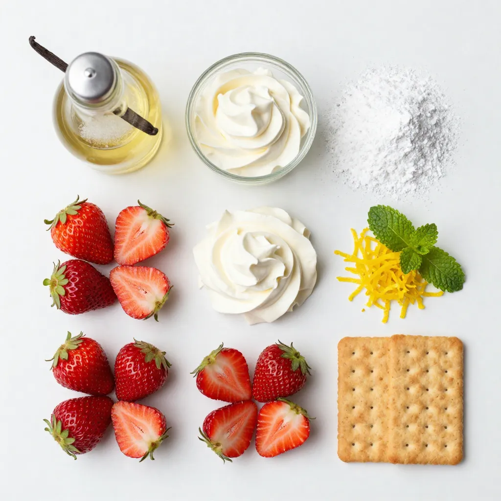 A delightful and refreshing layered dessert featuring strawberries, whipped cream, and graham crackers.