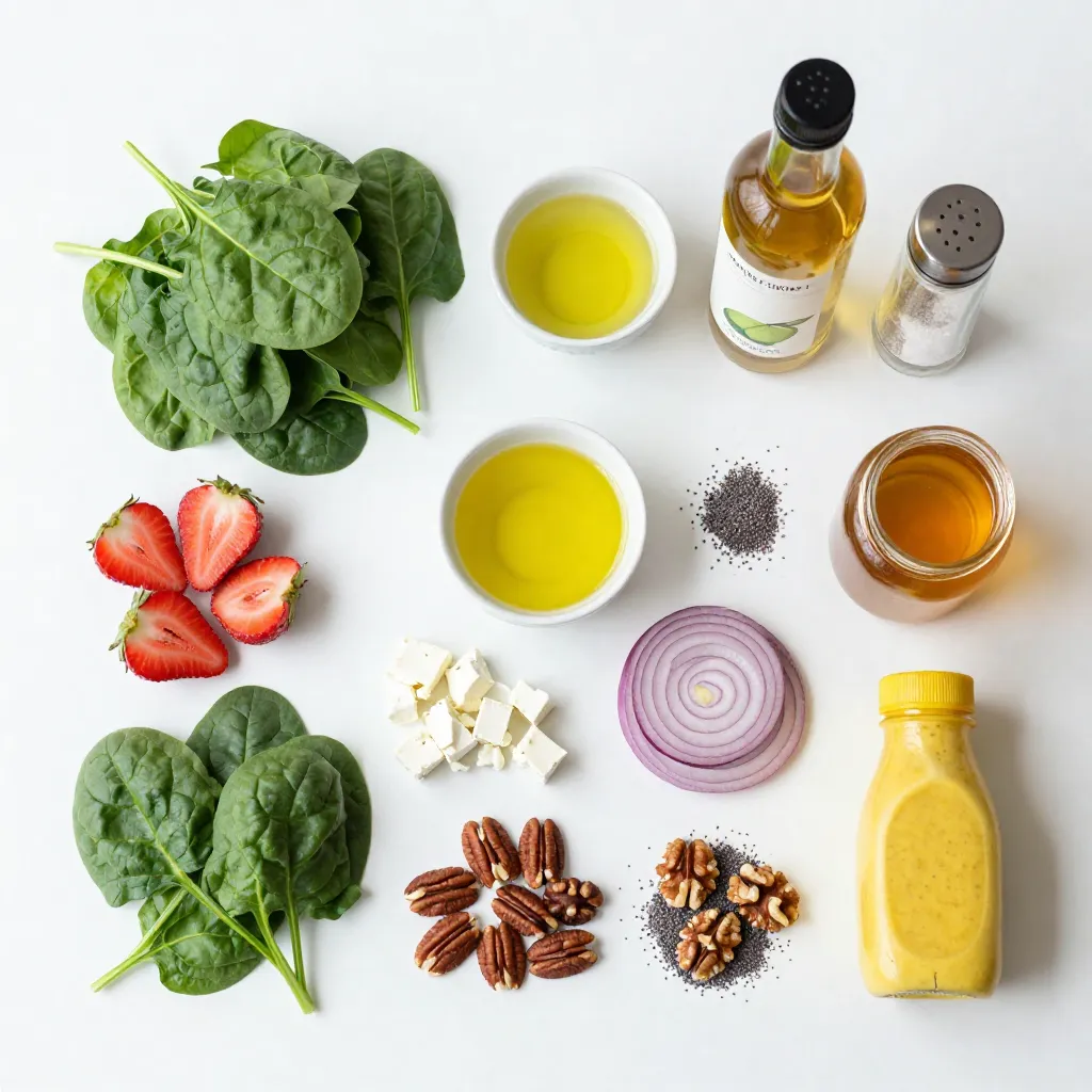 - 5 cups fresh baby spinach, thoroughly washed and gently dried - 2 cups ripe strawberries, hulled and elegantly sliced - 1/2 cup feta cheese, delicately crumbled - 1/4 cup red onion, finely sliced into thin rings - 1/4 cup pecans or walnuts, coarsely chopped - 1 tablespoon poppy seeds To make a delicious Strawberry Spinach Salad, you need fresh ingredients. Baby spinach is the base. It offers a mild flavor and a vibrant green color. Ripe strawberries add sweetness and a pop of red. Their juicy texture brightens the dish. Feta cheese brings creaminess and tang, balancing the sweetness of strawberries. Thinly sliced red onion adds a sharp bite. Nuts like pecans or walnuts give a crunchy contrast. Poppy seeds sprinkle on top for a delightful crunch and visual appeal. Each ingredient plays a key role in this salad. - 1/4 cup high-quality olive oil - 2 tablespoons apple cider vinegar - 1 tablespoon pure honey - 1 teaspoon Dijon mustard - Salt and freshly cracked black pepper, to taste The dressing is simple but flavorful. High-quality olive oil creates a smooth base. Apple cider vinegar adds a tangy kick. Honey sweetens the dressing, balancing the vinegar's sharpness. Dijon mustard gives it a creamy texture and depth. Lastly, salt and pepper enhance all the flavors. This dressing ties the salad together, making every bite enjoyable. {{ingredient_image_2}} - In a small mixing bowl, combine: - 1/4 cup high-quality olive oil - 2 tablespoons apple cider vinegar - 1 tablespoon pure honey - 1 teaspoon Dijon mustard - Salt and freshly cracked black pepper, to taste To make the dressing, whisk these ingredients together. You want a smooth mix that blends well. - In a large salad bowl, mix the following: - 5 cups fresh baby spinach - 2 cups ripe strawberries, sliced - 1/2 cup crumbled feta cheese - 1/4 cup red onion, sliced thin - 1/4 cup coarsely chopped pecans or walnuts After mixing, drizzle the poppy dressing over the salad. This adds great flavor to each bite. - With gentle hands, toss the salad. Make sure every ingredient gets some dressing. - Sprinkle 1 tablespoon of poppy seeds on top for a nice crunch. Serve the salad right away for the best taste. You can chill it for up to 30 minutes if you prefer. - Use fresh, seasonal strawberries. They taste best and add vibrant color. - Rinse spinach properly under cold water. This removes dirt and keeps it crisp. - Add optional spices like a pinch of cinnamon or nutmeg. These deepen the flavor. - Personalize the dressing by mixing in herbs like basil or mint for a twist. - Serve in chilled salad bowls for a refreshing look. - Garnish with whole strawberries and an extra sprinkle of poppy seeds. This creates an eye-catching centerpiece. Pro Tips Fresh Ingredients Matter: Always use the freshest spinach and strawberries you can find for the best flavor and texture in your salad. Customize Your Nuts: Feel free to swap out pecans or walnuts for your favorite nuts, such as almonds or pistachios, to add a unique twist. Chill for Flavor: Allowing the salad to chill for about 30 minutes before serving will enhance the flavors as they meld together. Create a Vibrant Presentation: Arrange the strawberries and nuts artfully on top before serving for a stunning visual appeal. {{image_4}} You can make your salad even better with more fruits. Try adding blueberries or sliced peaches. They add color and a sweet touch. You can also mix in diced apples for crunch. Cheese can change the flavor too. Feta gives a nice tang, but goat cheese works well too. If you want something creamy, try mozzarella or even blue cheese. Each choice gives a new taste to the salad. If you want a new dressing, balsamic vinaigrette is a great option. It adds a sweet and tangy flavor. Just mix balsamic vinegar with olive oil, salt, and pepper. This dressing pairs well with strawberries and spinach. You can also try creamy dressings. A yogurt-based dressing adds a nice texture. Mix plain yogurt with lemon juice and honey for a light touch. It keeps the salad fresh while adding creaminess. Change the salad for the seasons. In fall, add roasted squash and cranberries. This gives a warm, hearty feel. Winter is great for adding citrus fruits like oranges and grapefruit. They brighten up the dish with color and flavor. For holidays, add festive ingredients. Pomegranate seeds look beautiful and taste great. You can also sprinkle nuts like pecans for a crunchy bite. These changes make the salad special for any occasion. To keep your Strawberry Spinach Salad fresh, store it properly. Place the salad in an airtight container. This helps prevent wilting and keeps flavors intact. If you have leftover dressing, store it separately. This keeps the salad crisp for longer. In the refrigerator, the salad lasts about one day. After that, the spinach may become soggy. Check for signs of spoilage. If the strawberries look mushy or the spinach is slimy, it's time to toss it. Always trust your senses when it comes to food safety. Yes, you can prepare the salad ahead of time. You can wash and dry the spinach. Slice the strawberries and onions. You can even crumble the feta cheese. Just keep these items in separate containers in the fridge. This way, they stay fresh. Add the nuts and dressing right before serving. This keeps everything crisp and tasty. Yes, there are many substitutes for honey. You can use maple syrup or agave nectar. Both offer a similar sweetness. If you want a sugar option, try brown sugar. Just mix it well to dissolve. Each substitute adds a different flavor. Choose the one that suits your taste best. You can use several nuts in this salad. Almonds and cashews work well. They add a nice crunch too. If you want a different taste, try pistachios. Each nut gives a unique twist. Feel free to explore what you like best. This blog post covered key elements for making a fresh and tasty salad. We explored simple ingredients like spinach, strawberries, and feta. I shared steps for mixing and dressing you
