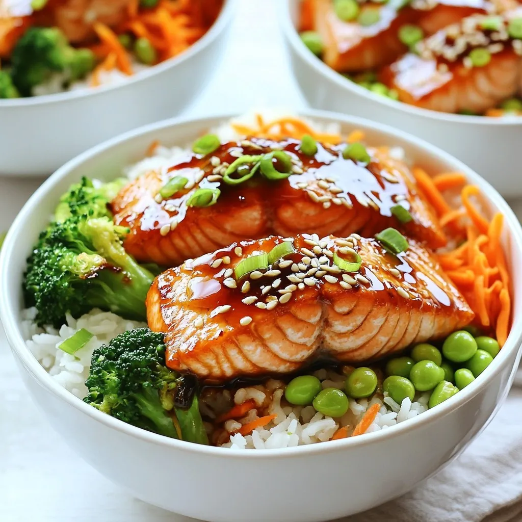 For a beautiful presentation, use colorful bowls. Layer the rice, veggies, and salmon neatly. You can add a lime wedge for zest. A small dish of extra teriyaki glaze on the side is great for those who enjoy more sauce.