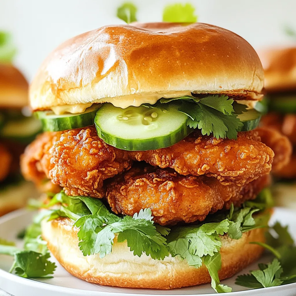 A delicious sandwich featuring crispy fried chicken thighs marinated in a flavorful blend of buttermilk, fish sauce, and Sriracha, served with fresh toppings and spicy mayo.